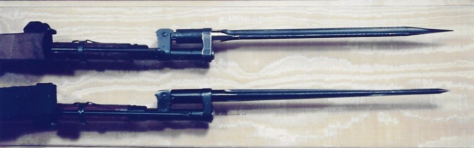 My apologies. I had reservations when I posted that first Gun Website picture. I had questions and concerns about what I could and could not see. After seeing that second Gun Website picture, my concerns were confirmed. Only the Type 63/68 on the right side is real and correct. The on a one on the left is a FAKE. It will not mount on any Type 63/68 or any other rifle. The sliding hit piece may be correct, but the blade appears to be from a Type 56 (SKS). The blade is not milled /cut to be able to engage the legs under the front sight base. There is no way to support or lock in place the front part of the bayonet. The spring is also too long and apparently from an SKS as well. It would also prevent the hilt from engaging the FSB legs and locking in place. The SKS bayonet is designed to be mounted and locked in place using a muzzle ring like the clamp on AK bayonet on the far left.
