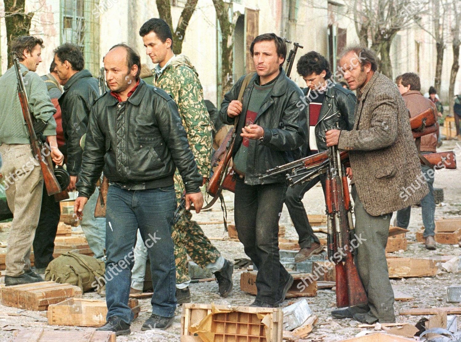 In these photos, of the looting of the barracks of the Albanian army, we can see in the photo of the man alone, that the bayonet seems pointed.