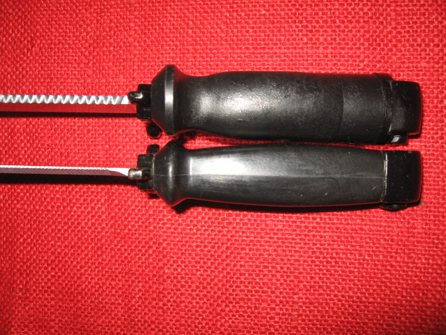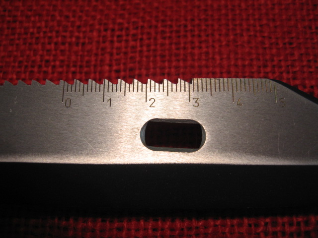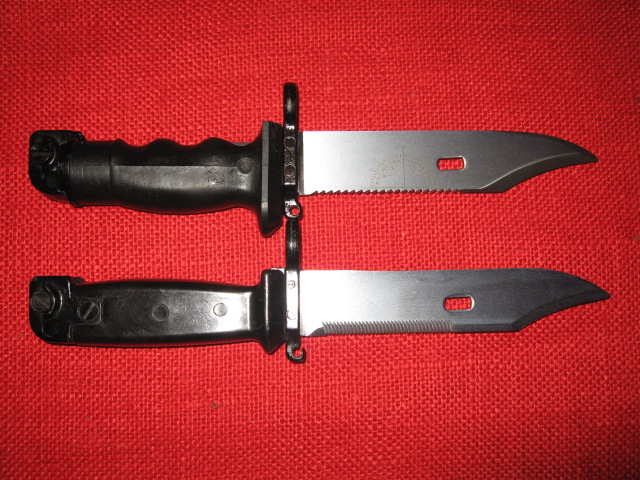 Here are pictures of the unique KM87 scabbard with the permanently attached hanger. The hanger has small and large belt loops plus a signaling mirror. The cutter plate also is different and is shown next to a standard East German Type II scabbard. Note the screw driver tip.