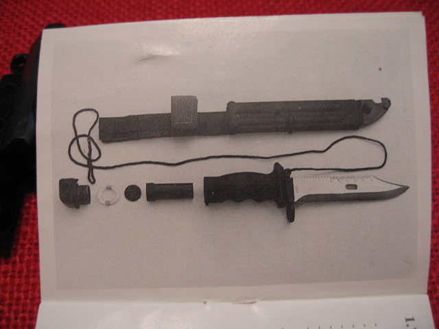 Here are a few more pictures of the KM87 bayonet and scabbard. Details of the hole in the front of the scabbard, for placement of the lower hanger rivet. The top of the scabbard and top hanger rivets. The users manual with the serial number hand written on the back to match the numbers on the bayonet blade and pommel. Pictures from the manual of the items inside hollow grip and pommel. I did not want to unpack mine as it would be difficult to repack all the items. Also a picture of one in the bag with the Para cord and manual. I have one I opened and display and a 2nd one still sealed in the bag. Mike