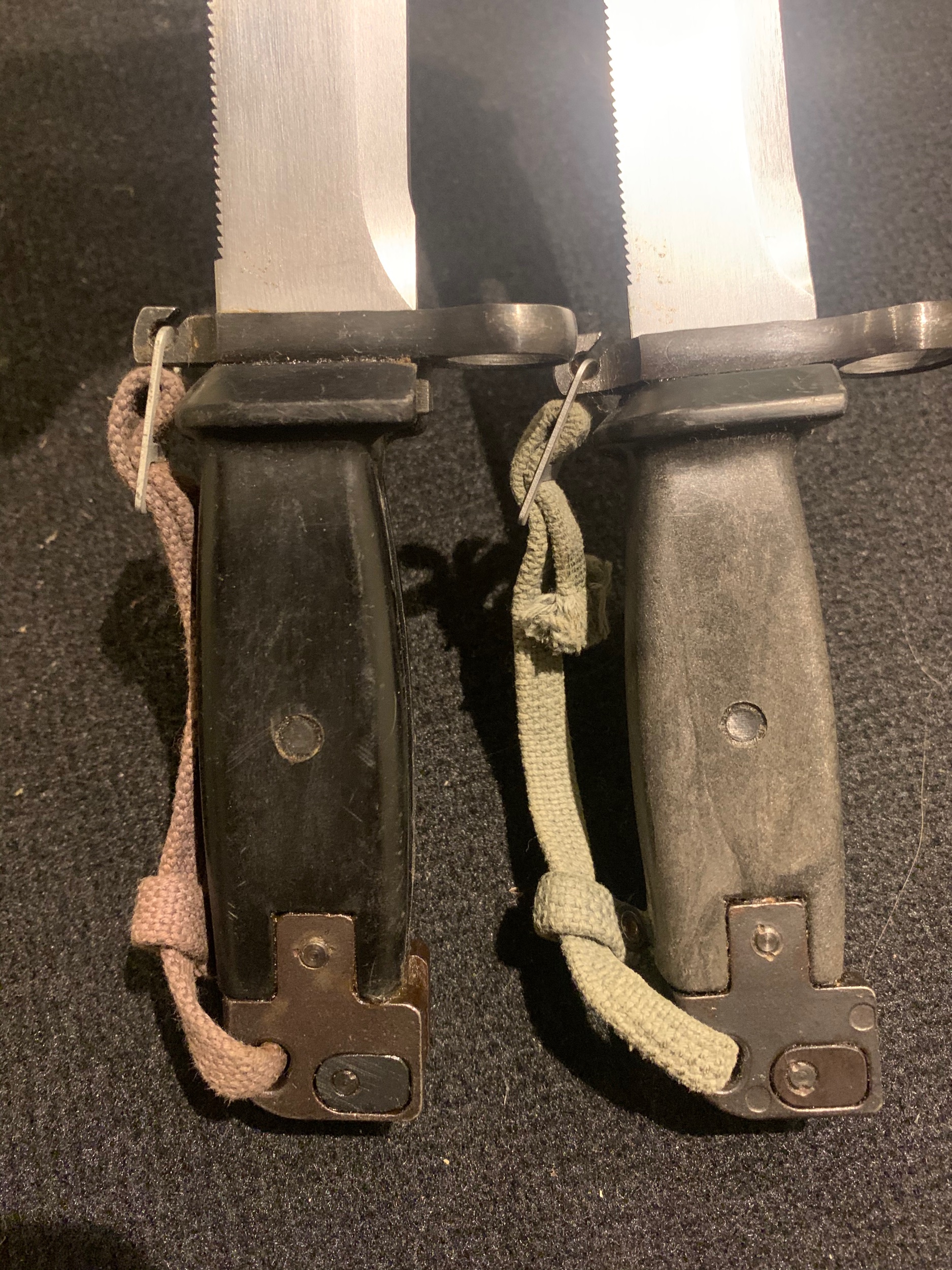 Something else to consider regarding the "matt" finished bayonets. At different points in time, most, if not all, the countries manufacturing these plastic scabbards and grips experimented with and changed to different base materials. Russia, East German, Hungary, Poland, etc.. It would make since that Yugoslavia would have done likewise. As evidence of this look this topic on this Forum: Yugoslavian AKM 6X4 Type II Scabbard Variations. At some point in time it appears that the material and molding of the scabbard changed from smooth plastic to a more durable material. It is very possible that the material used to mold the grips also changed at this point. Mike