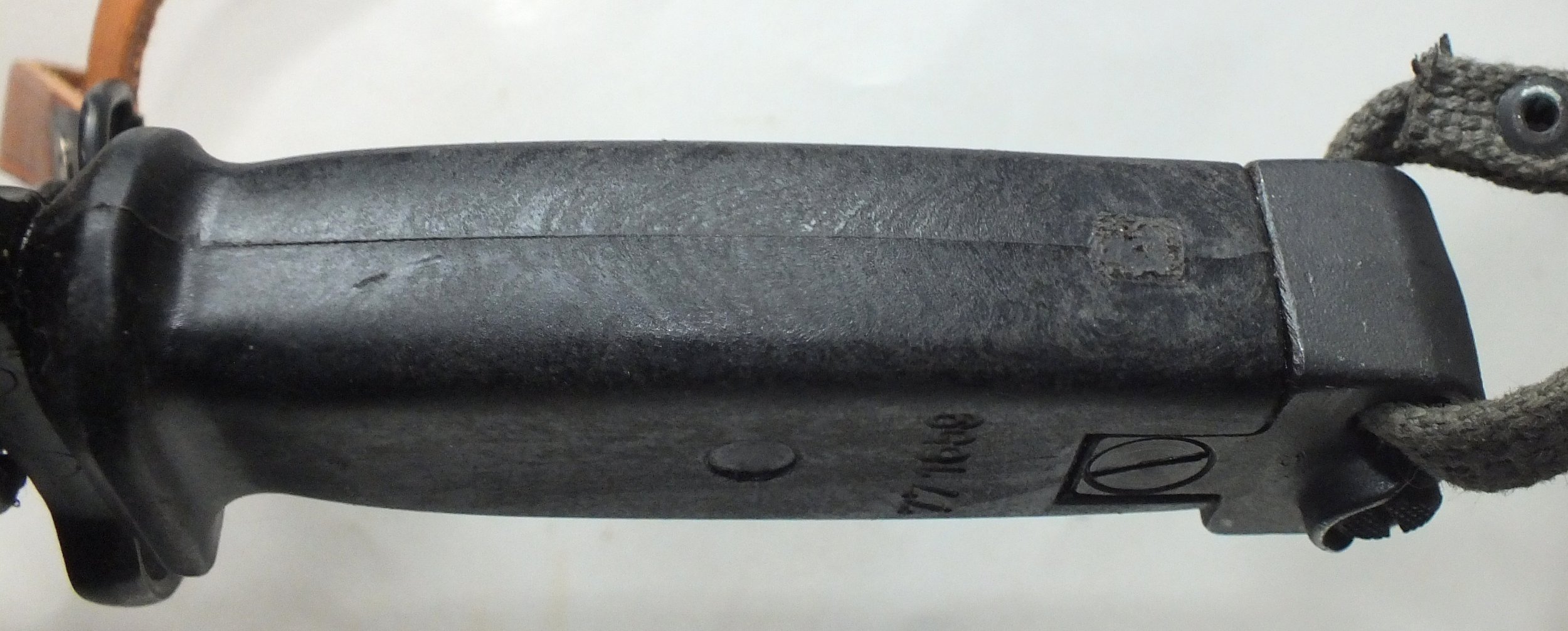I still believe that the matt finished ones that are found in excellent matching condition are a result of a difference in either the material or molding process. The formulation changed and/or less or different coloring dyes used creating a matt grey coloration. The usual molding process creates a hardened smooth exterior skin or shell over the interior material. Like crust on bread. Evidence of this is seen on all the reworked Russian bayonets and scabbards that have been ground on and have new numbers hand etched into the surface. This leaves the softer, lighter colored, interior material exposed. Perhaps by intentionally altering the temp, time, and or pressure during molding they arrived at a more even hardness without the thin, color intensive, outer shell? MIke