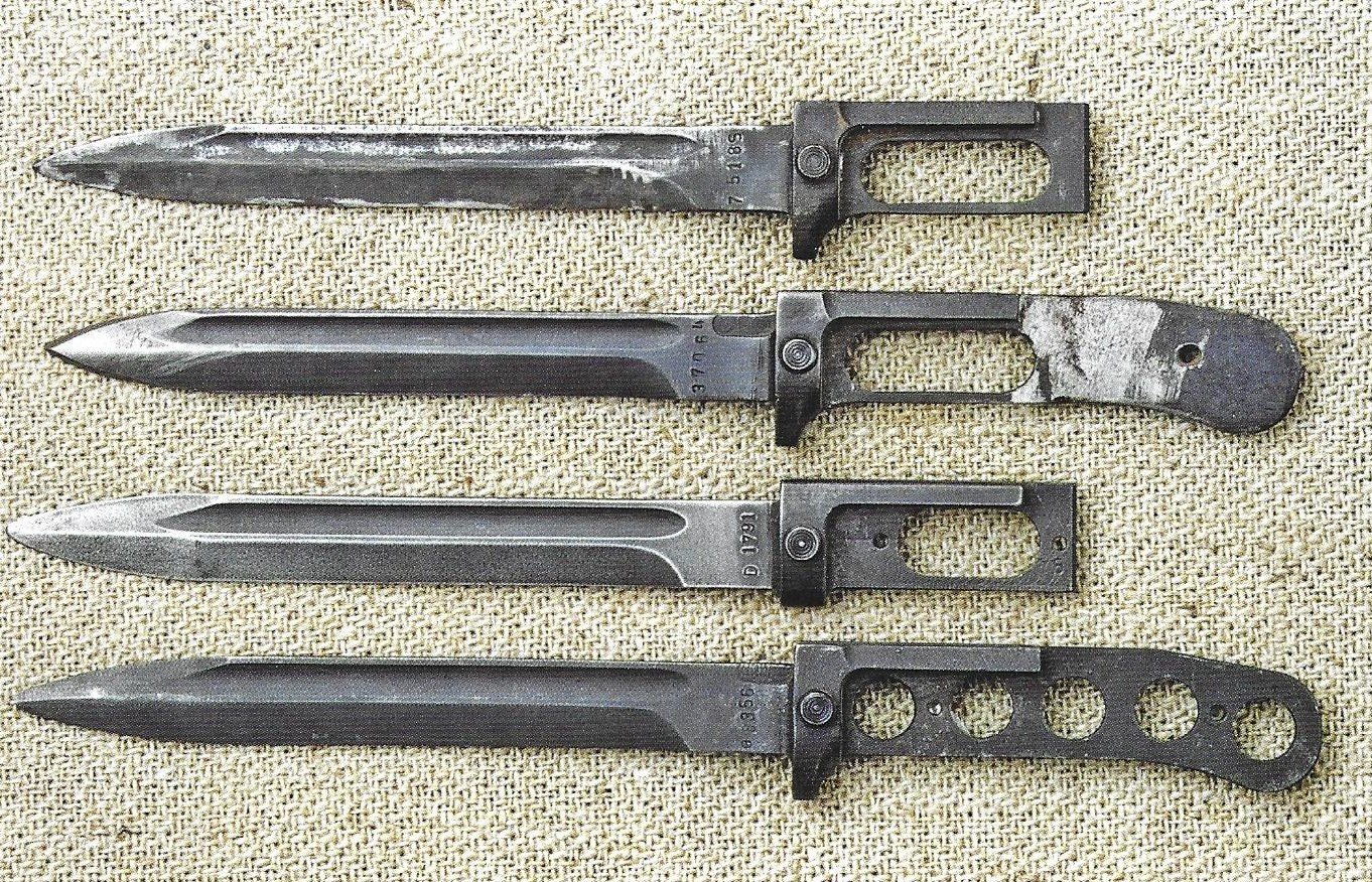 Here is the only official modification of the VZ58 Type II bayonet. This variation is a result of an attempted to up grade the Type II bayonet to Type III standards and appearance. This was done by welding a pre-formed metal extension on the short hilt tang. This extended the metal hilt tang and pommel plus provided a mounting, locating hole for new Type III grip panels. Once the welds were ground smooth and the new grip panels installed using the rivets in the standard positions it looks just like a Type III bayonet. This project was soon discontinued due to the expense. New Type III bayonets were easier and cheaper to mass produce.