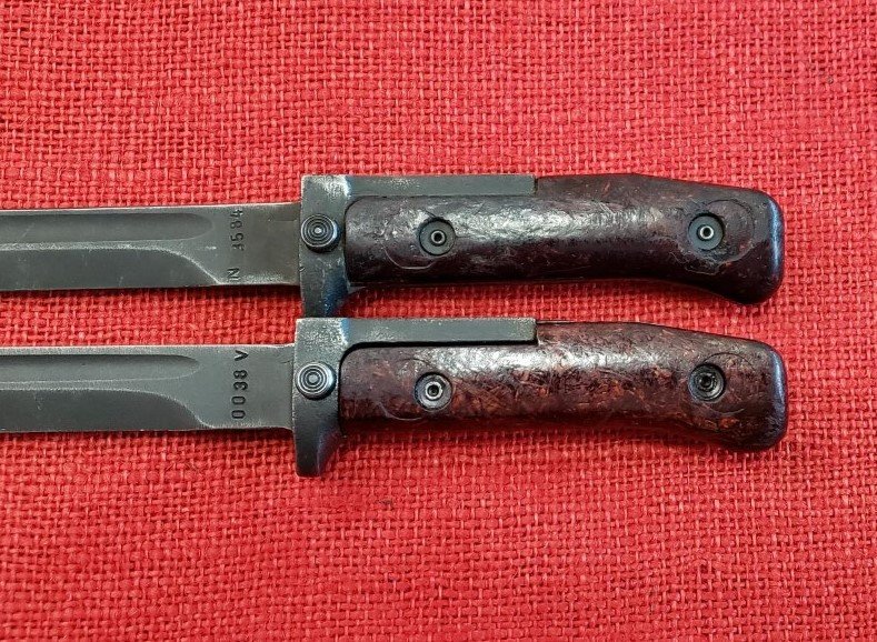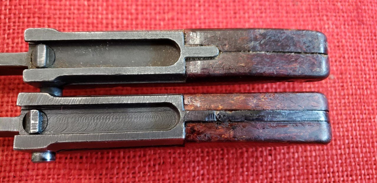 These modified bayonets are rare and difficult to identify. Without removing the grips, all that can be seen are evidence of welding and grinding on the top and bottom of the hilt tang where the weld was made. Pictures are borrowed as I do not have an example. Mike