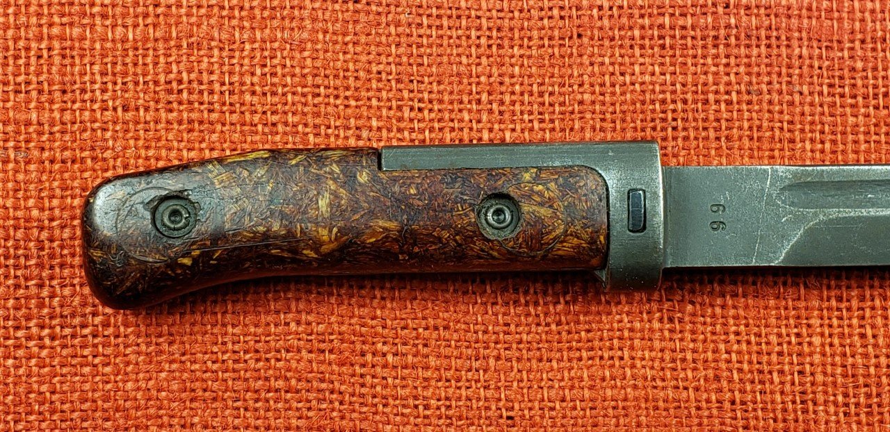 Note that any Type I bayonet without rivets or rivets in different locations is not original. The original and replacement wood grips were supplied pre-inletted and finished. The grip is held in position by the rivets and using the small holes in the metal hilt tang and grip. Also note that they only used a certain style of rivet and setting for ALL 3 Types of the VZ58 bayonets. All other rivets or fasteners are either from emergency repairs or unauthorized. Fakes and replicas are quite common. Mike
