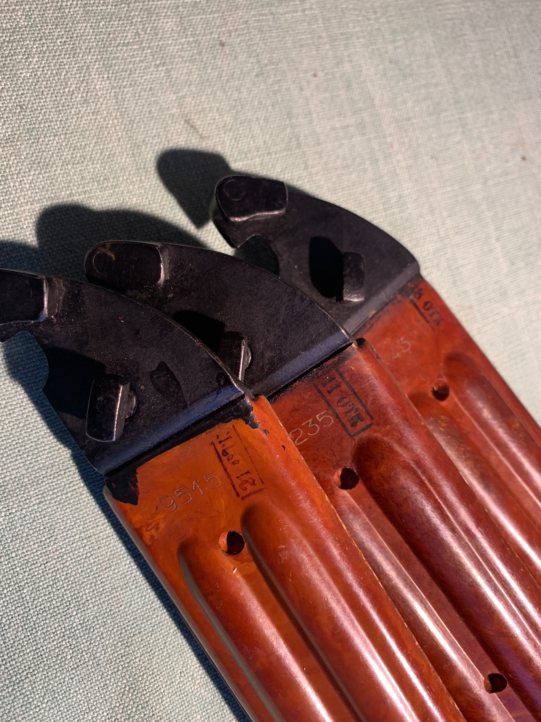 One thing unusual I did notice is the placement of the OTK acceptance stamp on the scabbards. The later Izhevsk OTK stamps were located toward the top of the scabbards between the ribs.
