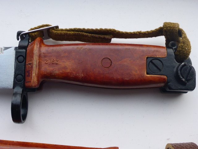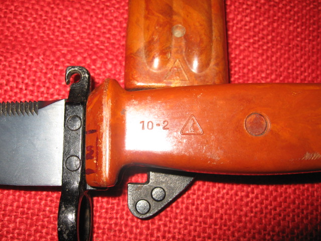 Here are pictures of a Russian AKM 6X4 Type II bayonet and scabbard with several modifications including machined lightening of the pommel. I found this item on eBay several years ago. It was advertised as a Russian "Spetsnaz" version with no providence. I added it to my collection as a representative example knowing that it may be a fake or fantasy item. I am showing it here to illustrate how the pommel could be modified by machining / milling. Mike
