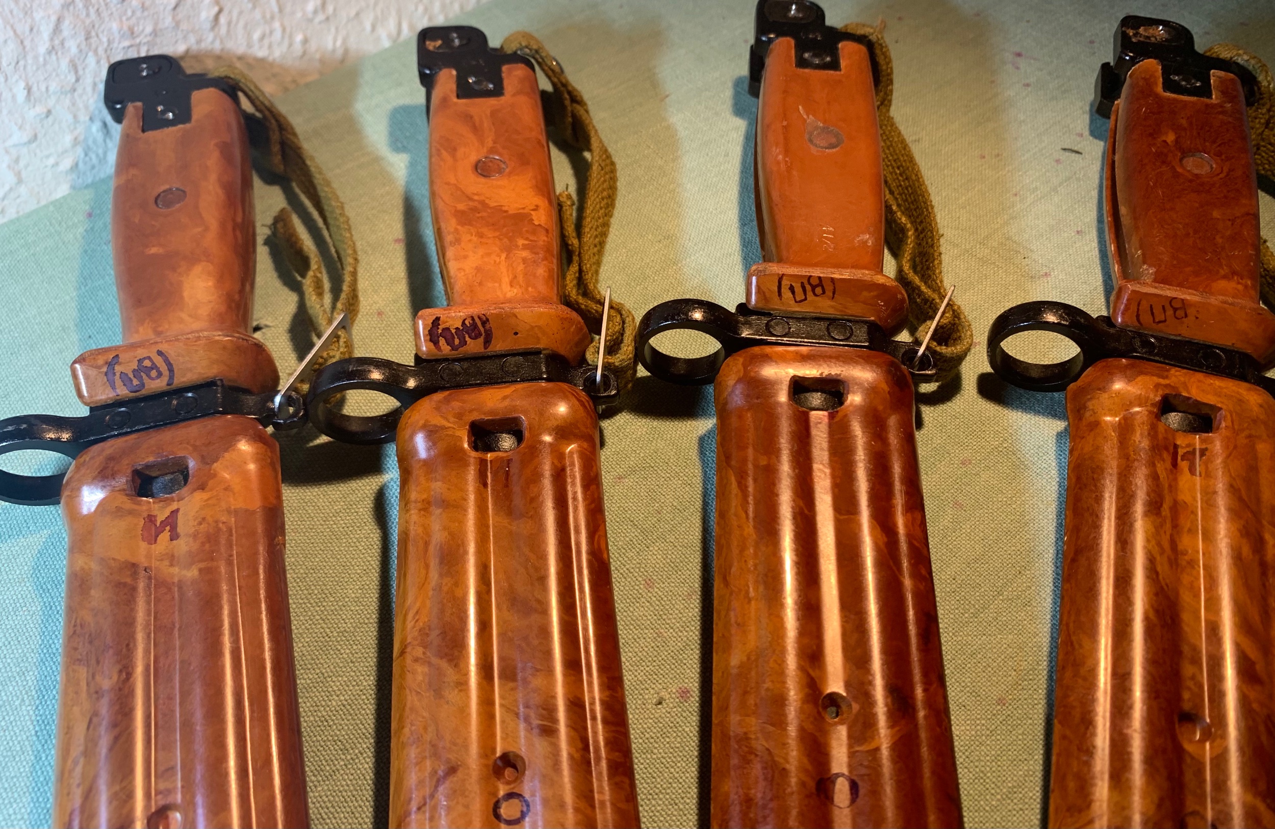 Nice group of new, un-numbered, unissued bayonets and scabbards. These are usually extra production, held in reserve as needed as replacements. They sometimes end up as "New Old Stock" as they are replaced by new designs.