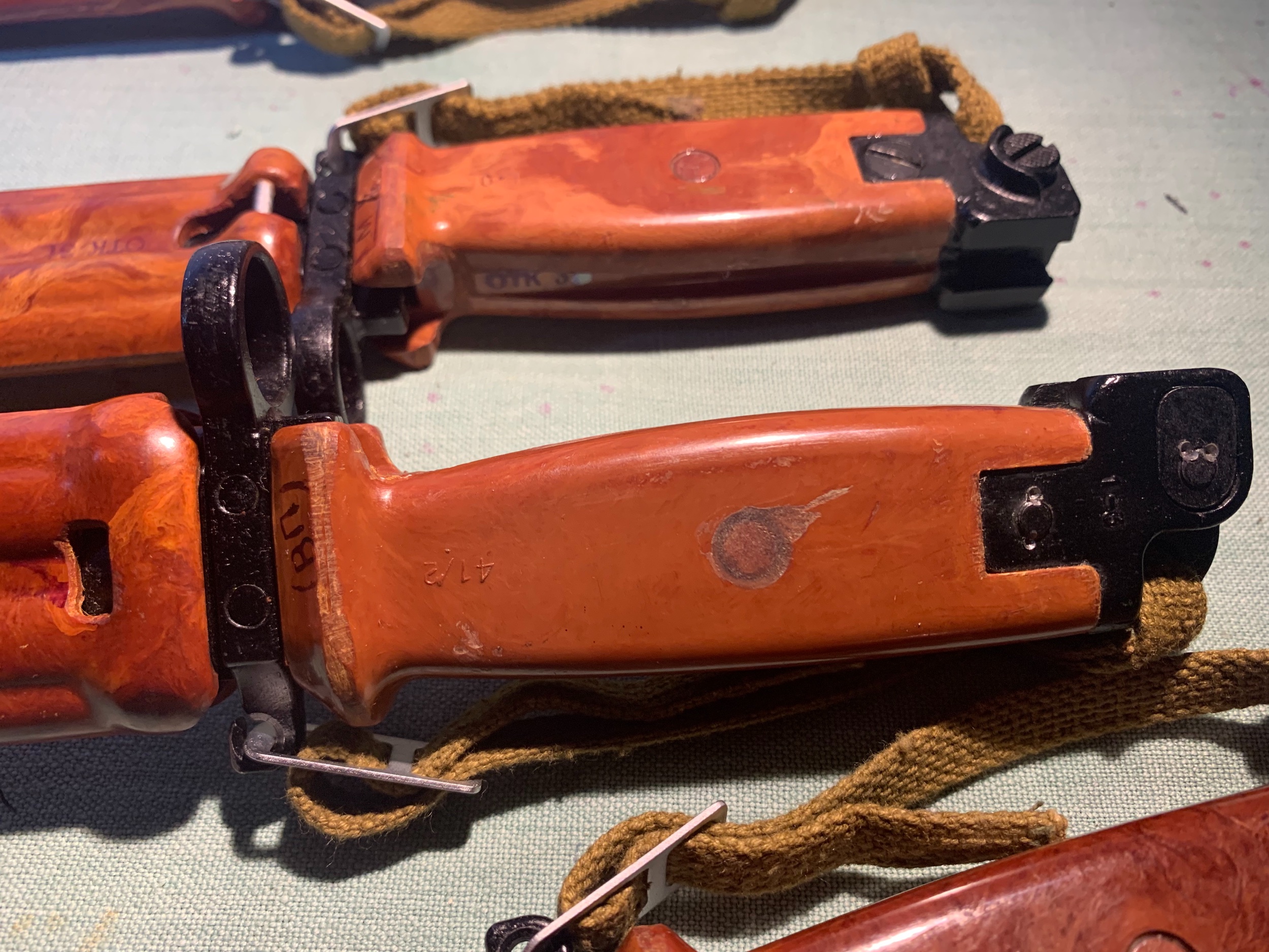 Recently a question was asked about a Tula version of the Russian AKM 6X4 Type III bayonet and scabbard. Here are some more detailed pictures of the Russian AKM 6X4 Type III pommels with the wrist straps removed. They are of the bayonets at the top of this topic and a milled version, (fake !?). They are all from the Izhevsk arsenal and have different markings. The last picture is of three Type III pommels, note the unique mold numbers and cast marks. Mike