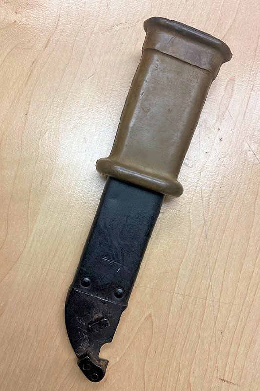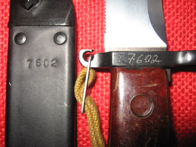 Supposedly these are of earlier production hence the glued on insulator piece. There is no stopper on the scabbard. The cosmoline is still present in sight and smell.