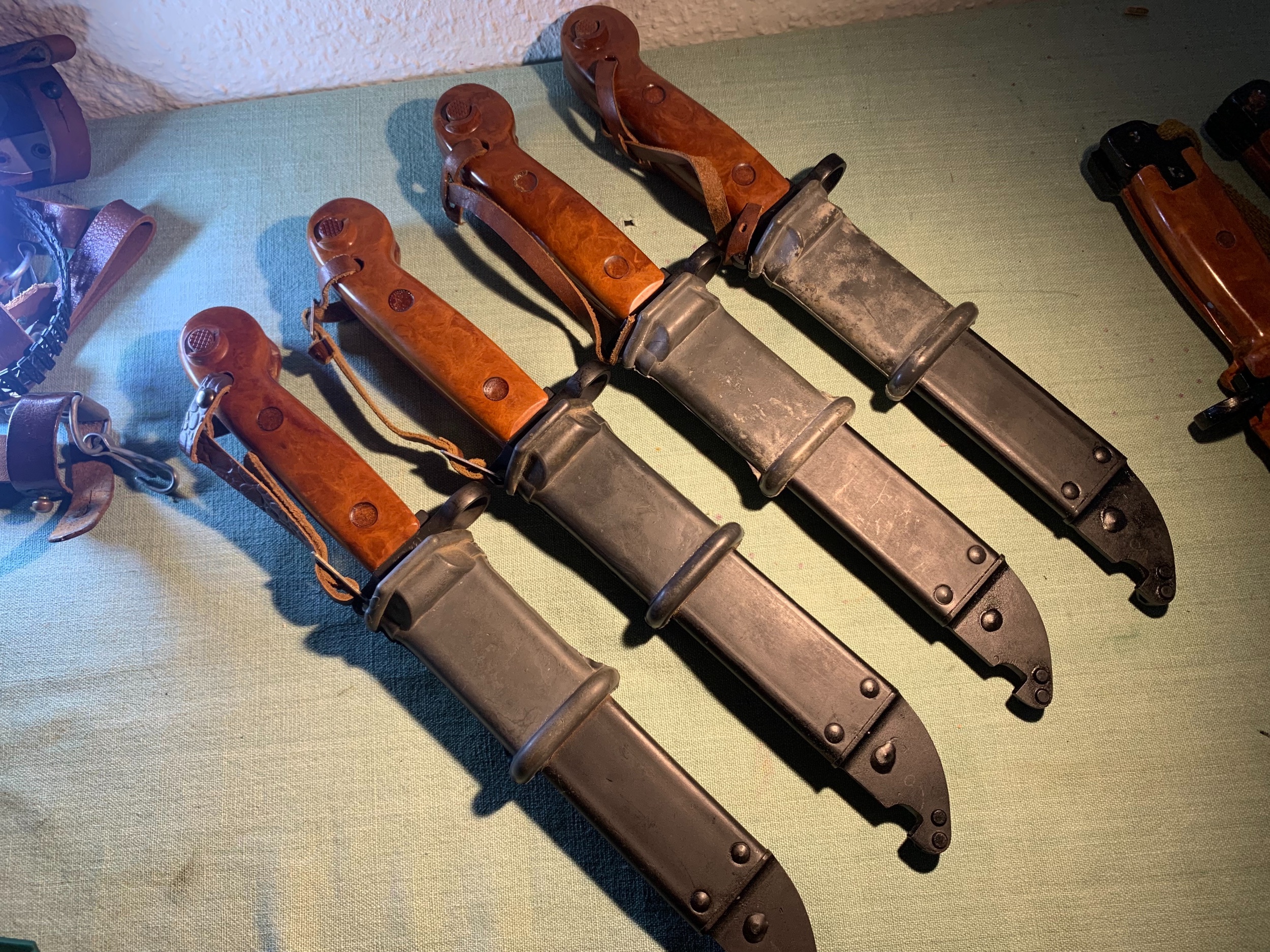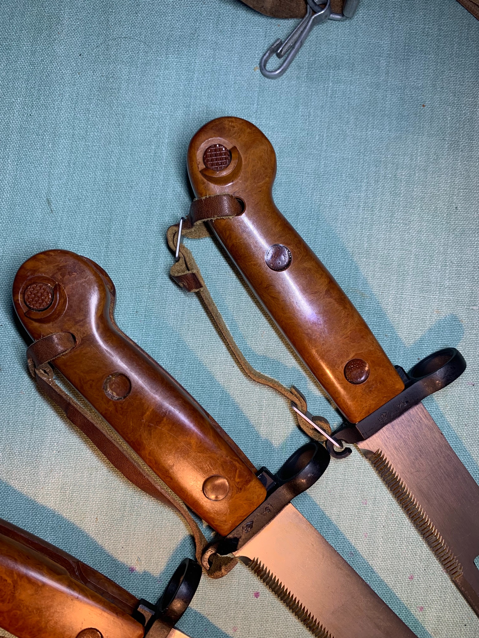 Wow! Where are you coming up with all these NOS Russian bayonet and scabbard variations lately? All of these appear to be early AKM 6X3 Type I bayonets and scabbards. I also noted the different variations of hand straps. Two are very early all leather ones. One is a little later version with two buckles. The third one is ...... well, different!? Reptile pattern embossed leather with a domed rivet and one buckle. Somehow this doesn't look right to me. especially on an early bayonet.