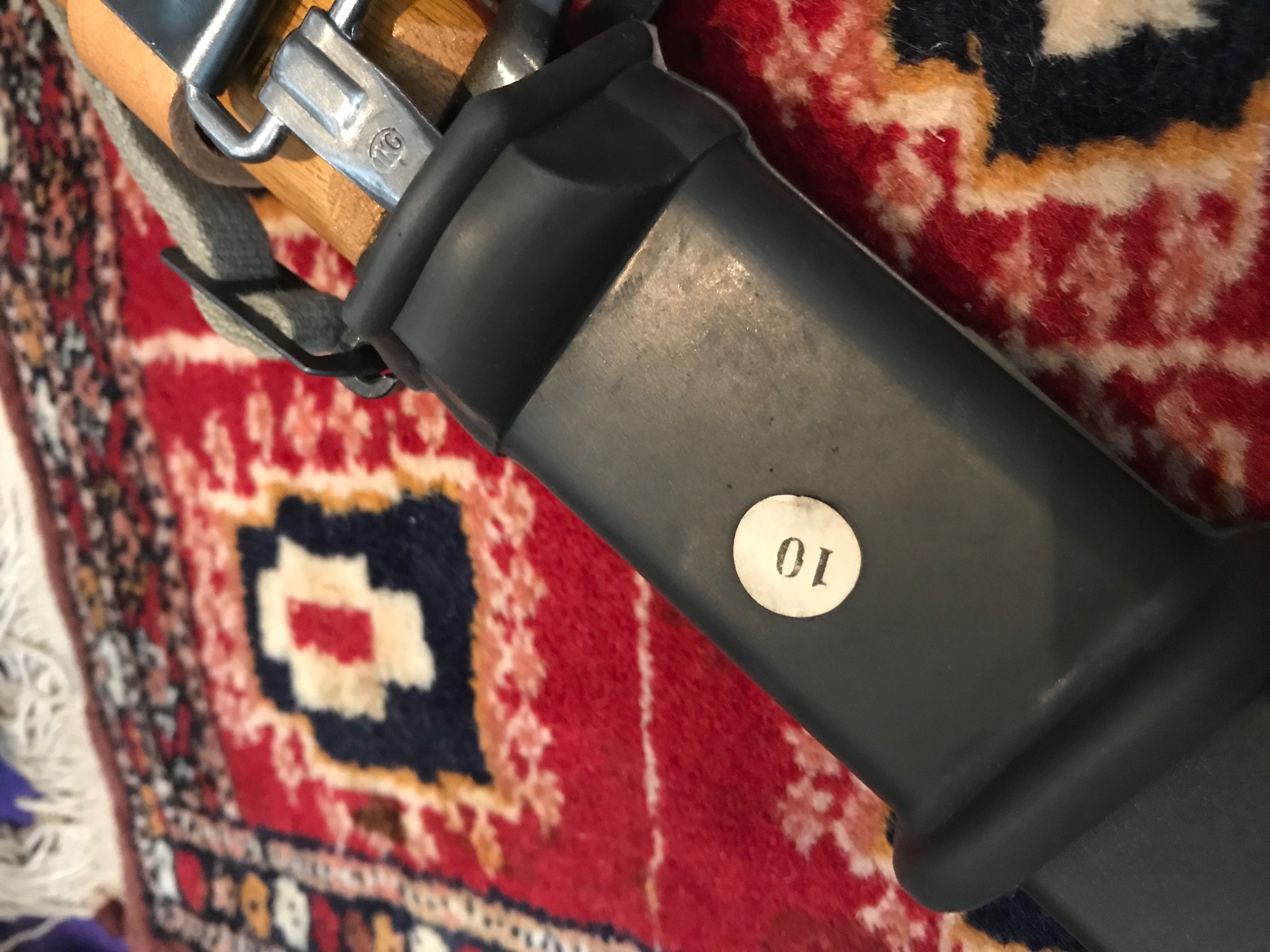 Third, Who made the belt hanger? It is not the usual correct Yugo hanger. This one appears to be a hand made one using a repurposed pack strap hook. This does not allow the bayonet and scabbard to swivel. Many of these hand made hangers came out of the Balkan’s post war. I have a couple with these hooks, some have snap buttons instead of the stud to close the hilt strap.