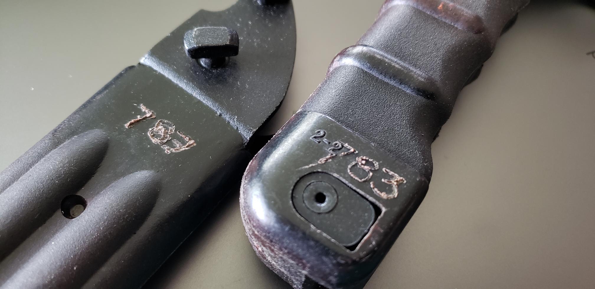 So the serial numbers are the crappy electro pencil, not the nice crisp ones. Numbers are both 6683. My thoughts are, I was in the Air Force long time ago, that back in the mid to late 90's or later some new privates got put on bayonet inventory/extended storage duty. One thing lead to another and they changed out the scabbards for the heck of it. We would write on stuff with marker on spots of equipment that would not be generally seen if attached to an airplane. Probably just bored 18-20 year olds. The military loves serial numbers on everything so they just added a number that was giving to them if they were not marked. The thing is some where there is a 6x5 plum with the wrong scabbard also.
