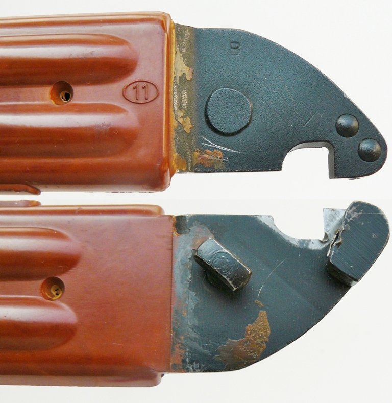 On the 6H4 with the black scabbard, the riveting of the crossguard is cleanly ground flat, the base of the attachment is left angular, very poorly marked with the acceptance mark, and the retaining ring is left with a sharp cast edge.