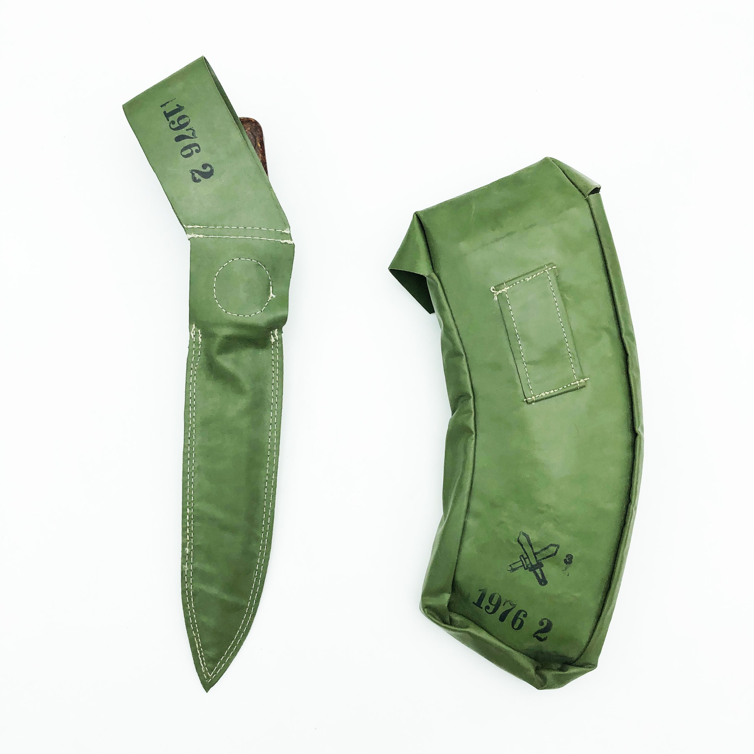 Here are a few more pictures of the GREEN VZ58 bayonet NBC scabbards along with a matching mag pouches and a belt/sling. One picture shows an assortment of markings and dates. Note that the oldest date, (1975), scabbard has slightly different stitching on the hilt strap.