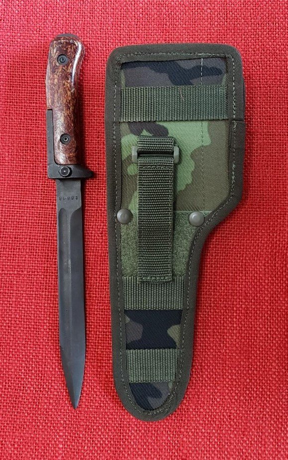 Mr. B. wrote: Sun Jan 03, 2016 7:10 pm Yes, examples of this new scabbard in both foliage and desert camo have been listed in eBay. Whether they were a commercial copy or a military overrun is unknown. The Czechs started development of a 5.56mm rifle system from 1986 -89 and adopted System "Lada" in 1991. This system included a new bayonet design. Somewhat similar to the VZ58 bayonet in size and style. The New design still has the mounting slot incorporated in the top of the hilt, but the catch is now located in the pommel. The blades are the same size and profile as the VZ58 and will fit both the VZ58 leather scabbard or the new fabric pattern. It appears that the early "Lada" prototypes, (M63), did use the original VZ58 scabbards. The new 5.56 system has replaced the VZ58 and it has been relegated to reserve status. This explains the large number of VZ58 bayonets available in the last few years. Even though the VZ58 bayonets fit in the new fabric scabbards this is not a correct match. M.