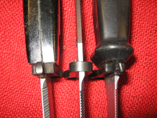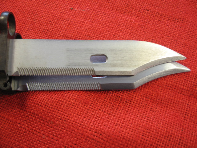 Here are some close up pictures of one of these bayonets disassembled. I don't usually do this and don't recommend it, but my analytical curiosity got the best of me. These bayonets are very well designed and manufactured and of very high quality fit and finish. A small detail I noticed on reassembly is that the heads of the grip machine screws and their nuts are of different thickness and not interchangeable front to rear. This is to make up for the front of the hilt is narrower than the rear. Very over engineered. It would have been much easier and more economical to just use a shorter screw!? M.
