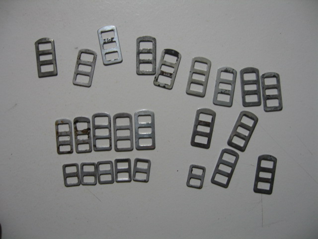 The metal buckles used on the wrist straps are stamped metal and come in a wide variety of sizes and shape detail. They are most commonly bare metal, but also are found painted black, blued, and with bright finishes. The buckles are difficult, if not impossible, to identify by country. Also they may well have been exchanged between the ComBloc countries as many other componets were at various times. Pictures are of an assortment of extra loose ones in my collection.