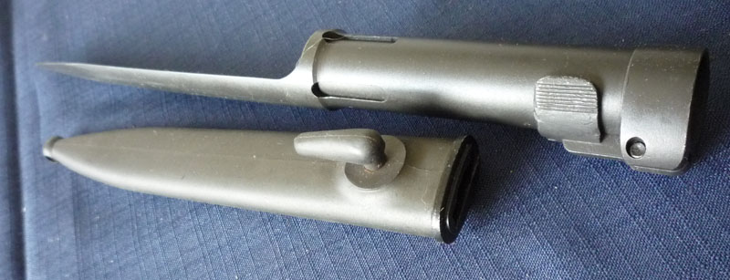 This is a South African R1 bayonet and scabbard. It is for their FN-FAL style weapons. This is the type of bayonet that was modified to fit on the South African Galil/Kalashnikov style R4 rifle. The R4 is featured in Martin Ivie's book "Kalashnikov Bayonets".