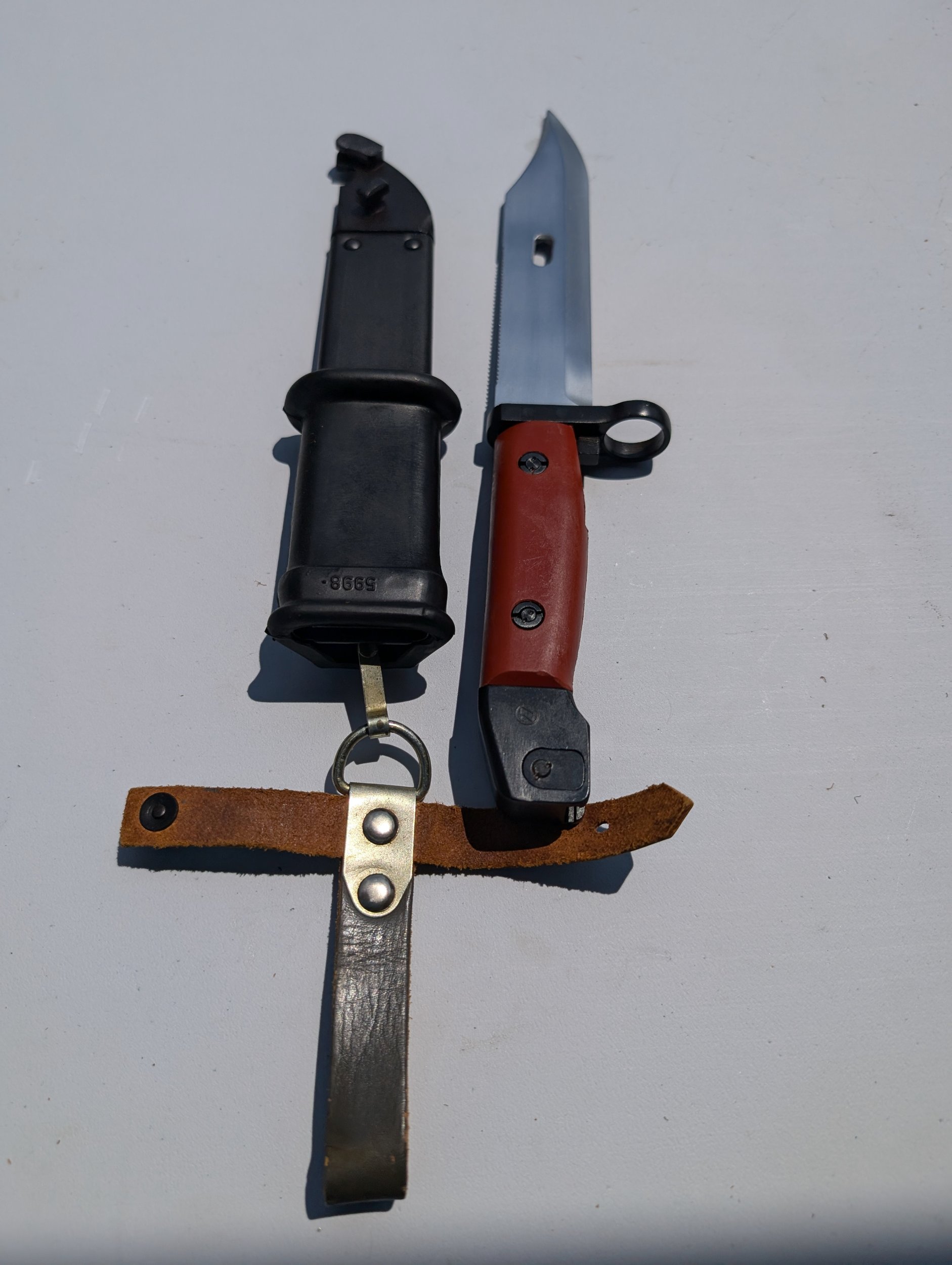 Very nice examples of these two variations, just like mine! It does look like you added a Russian hanger on the brown one. I would suggest replacing it with a short East German, (DDR), one to be correct. Who ever made these bayonets up used new unissued surplus DDR scabbards and hangers assemblies. The black scabbards would be correct with either a short or long hanger depending on if the were assembled for use with the DDR AKM 6X3 Type I, (transitional) or the AKM 6X4 Type II bayonet. This can be somewhat determined by the molded marks on the scabbard, early vs late. Mike