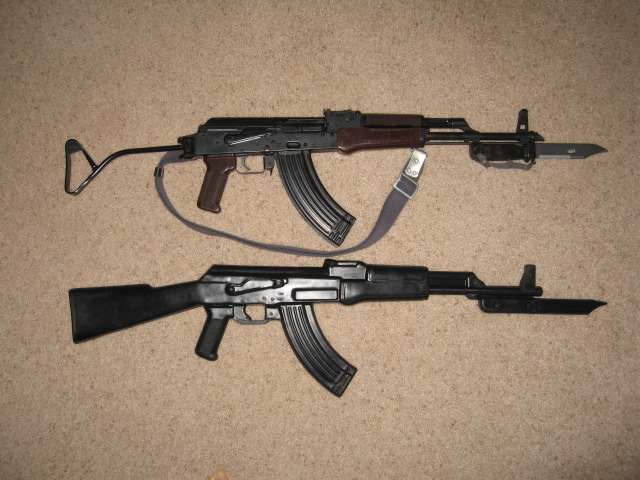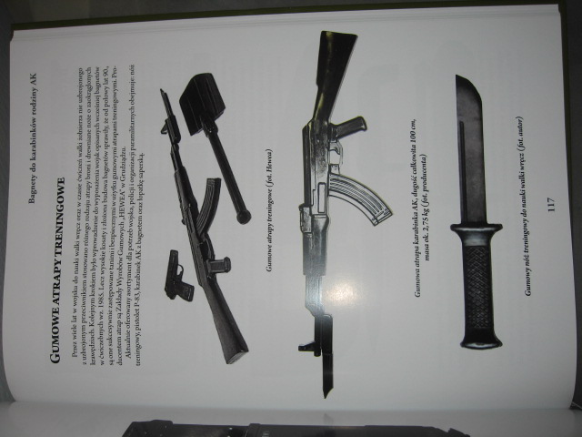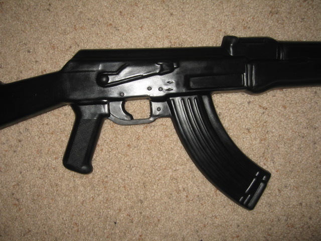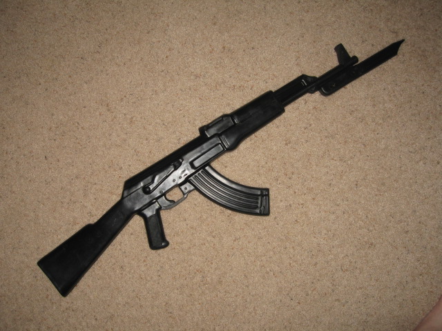 This is a solid, molded rubber training device designed to represent a Polish AK47 rifle with an attached bayonet. It has a metal core and is the correct size and weight to simulate an actual weapon. I am not sure what time period this trainer represents. The molded details are somewhat contradictive. The rifle receiver represents a forged AK47 rifle, but the bayonet has the bowie point of a 6H3, (type I), or a 6H4 (type II).