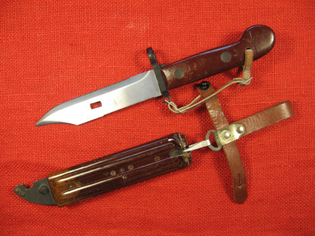 I bought this bayonet and scabbard several years ago from a Gulf War veteran who brought it back the way he found it as a souvenir. I included it today as I was doing research on Hungarian bayonets. I'm not sure how to classify it except as an Iraqi mix-master. The bayonet is a typical Hungarian AKM 6X3 Type I unmarked export bayonet. The scabbard however is an unmarked Iraqi Tabuk AKM Type II variation. The wrist strap appears to be Hungarian. The one piece hook hanger is typical and of unknown origin. Unusual and nice looking combination of bayonet and scabbard. Mike