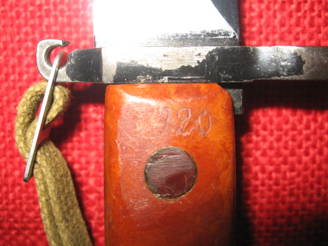 This is another version of a Russian AKM 6X3 Type I -Type II "transitional" bayonet and scabbard. This one is from the Izhevsk arsenal. This one may also be a result of a rework operation, but it is nearer original. The arsenal mark is on the flat behind the muzzle ring. The race track 11 and diamond GB marks are on the right side of the crossguard. The original(?) number 5920 is etched on the left side of the grip. However, the 5 has been partially obliterated, (deliberately?), and is hard to read. The scabbard has the original molded arsenal mark and the matching original number 5920 is etched in the correct place, but both the 5 and the 920 have been lined out separately. A new number 920 has been etched on the cutter plate. A possibility the bayonet and scabbard were kept together during inspection and rework. They do not show signs of much other repair except for the numbering. They also came with a period correct wrist strap and hanger. Mike