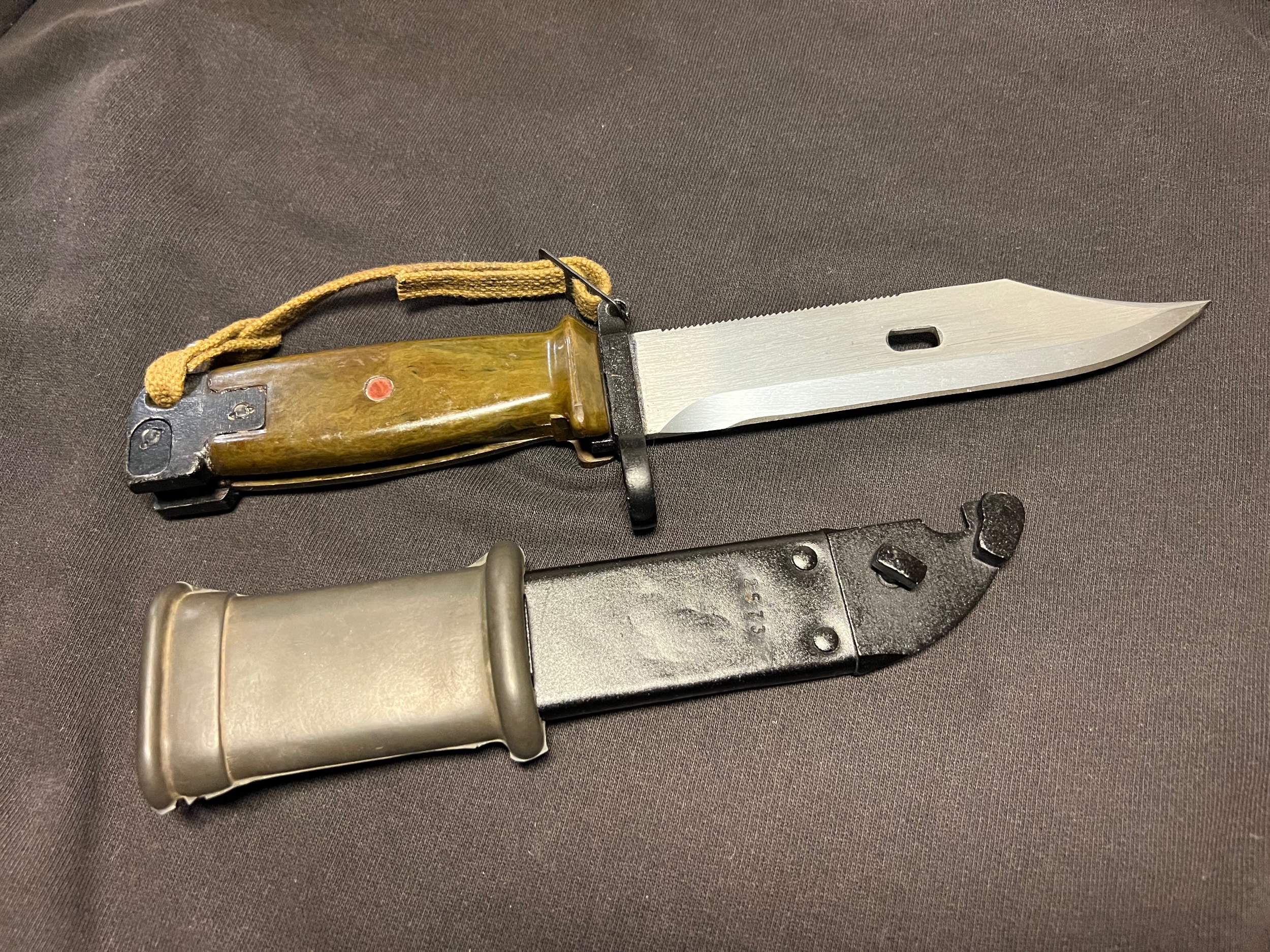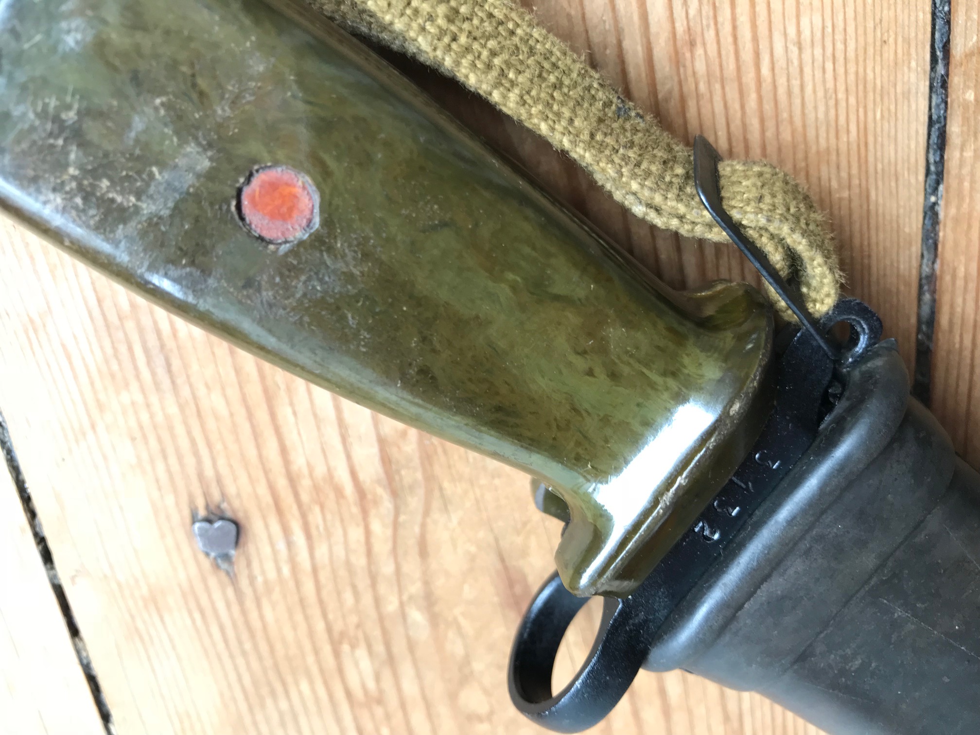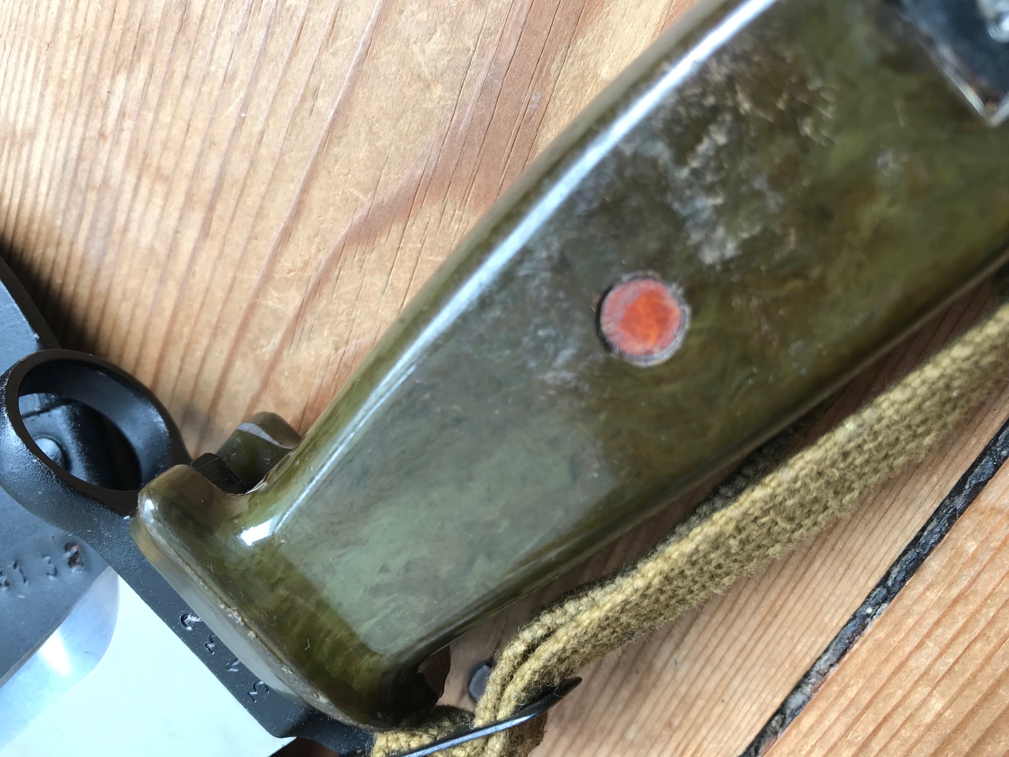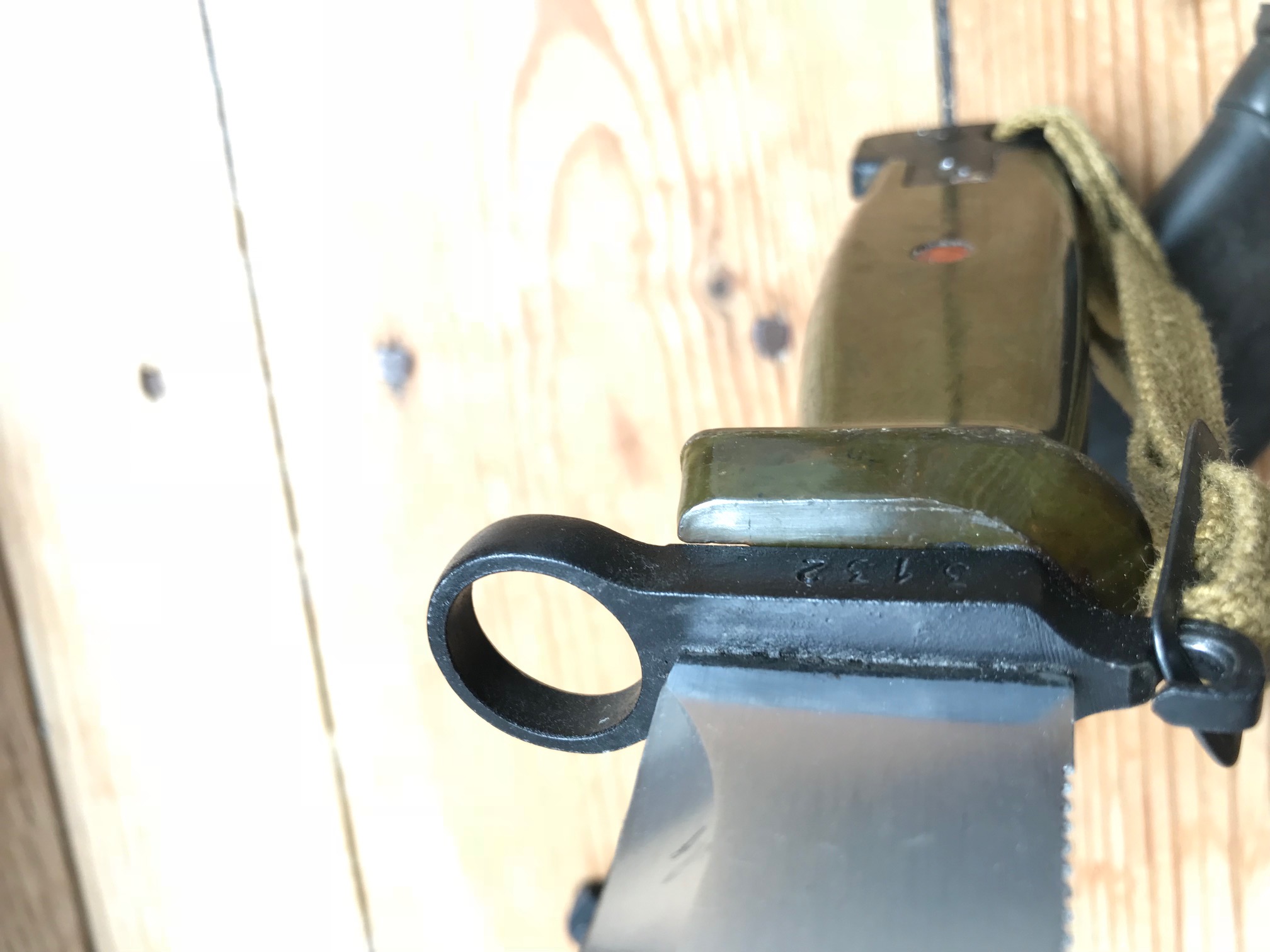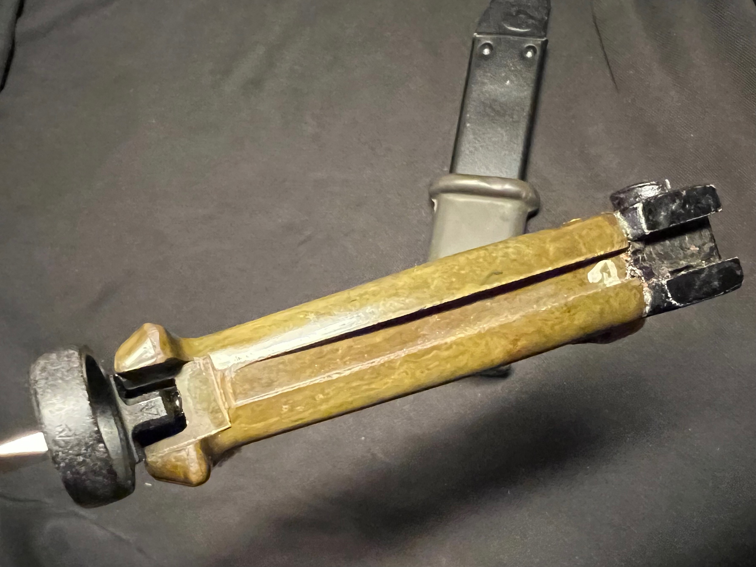 The blade shows sign of some pulling from the scabbard, but is in overall good condition. Im not sure if these scabbards were used before they ended up being paired with the border guard bayonet. The bulging on the scabbard could indicate prior use and the repainting? Im not sure. Or is it from the initial production?