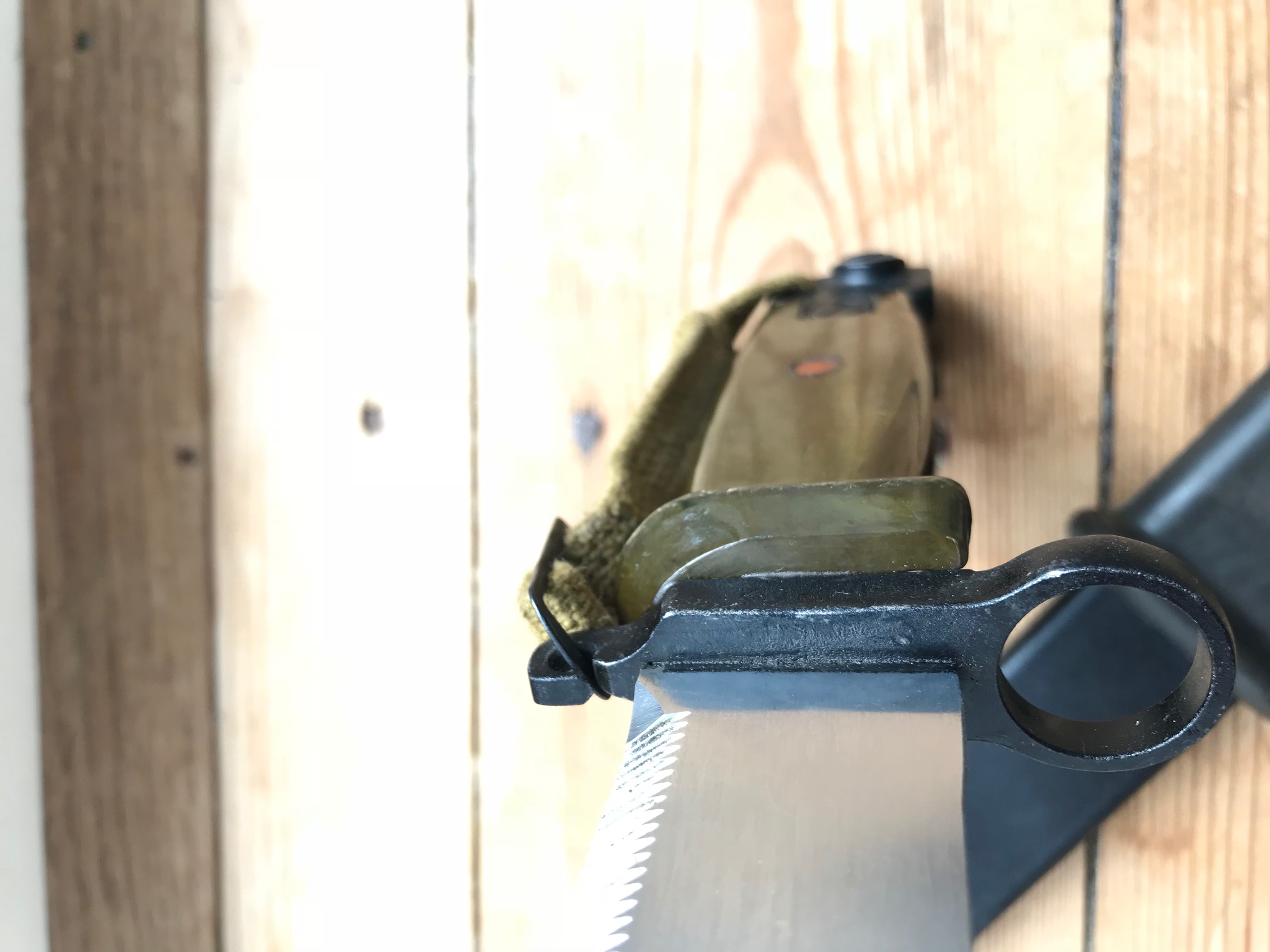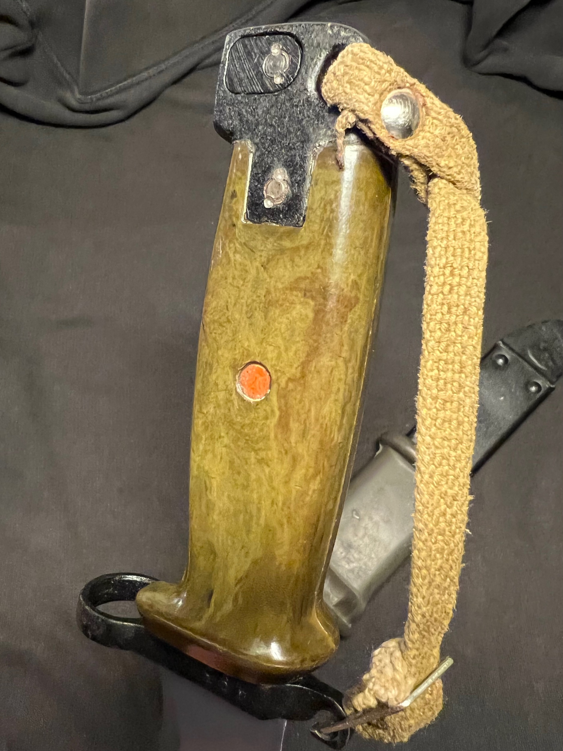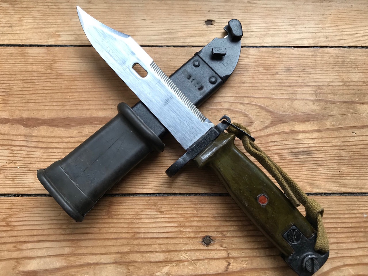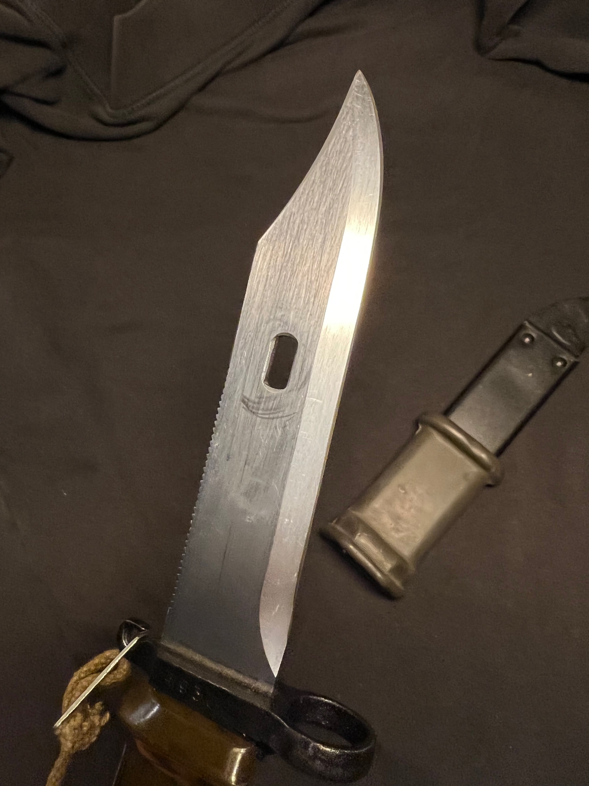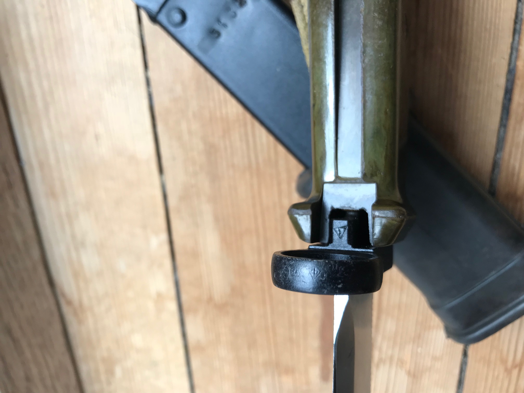 The blade shows sign of some pulling from the scabbard, but is in overall good condition. Im not sure if these scabbards were used before they ended up being paired with the border guard bayonet. The bulging on the scabbard could indicate prior use and the repainting? Im not sure. Or is it from the initial production?