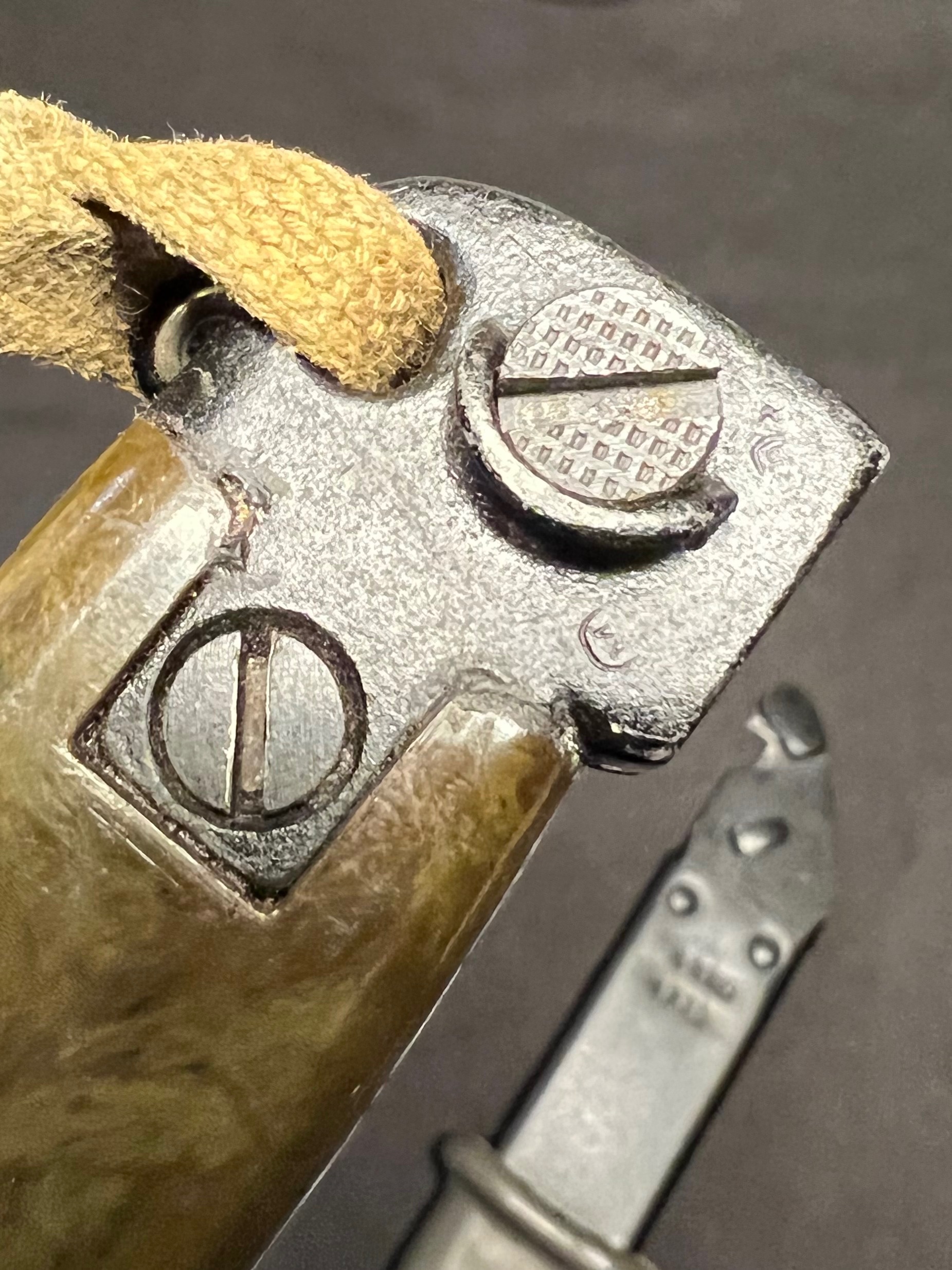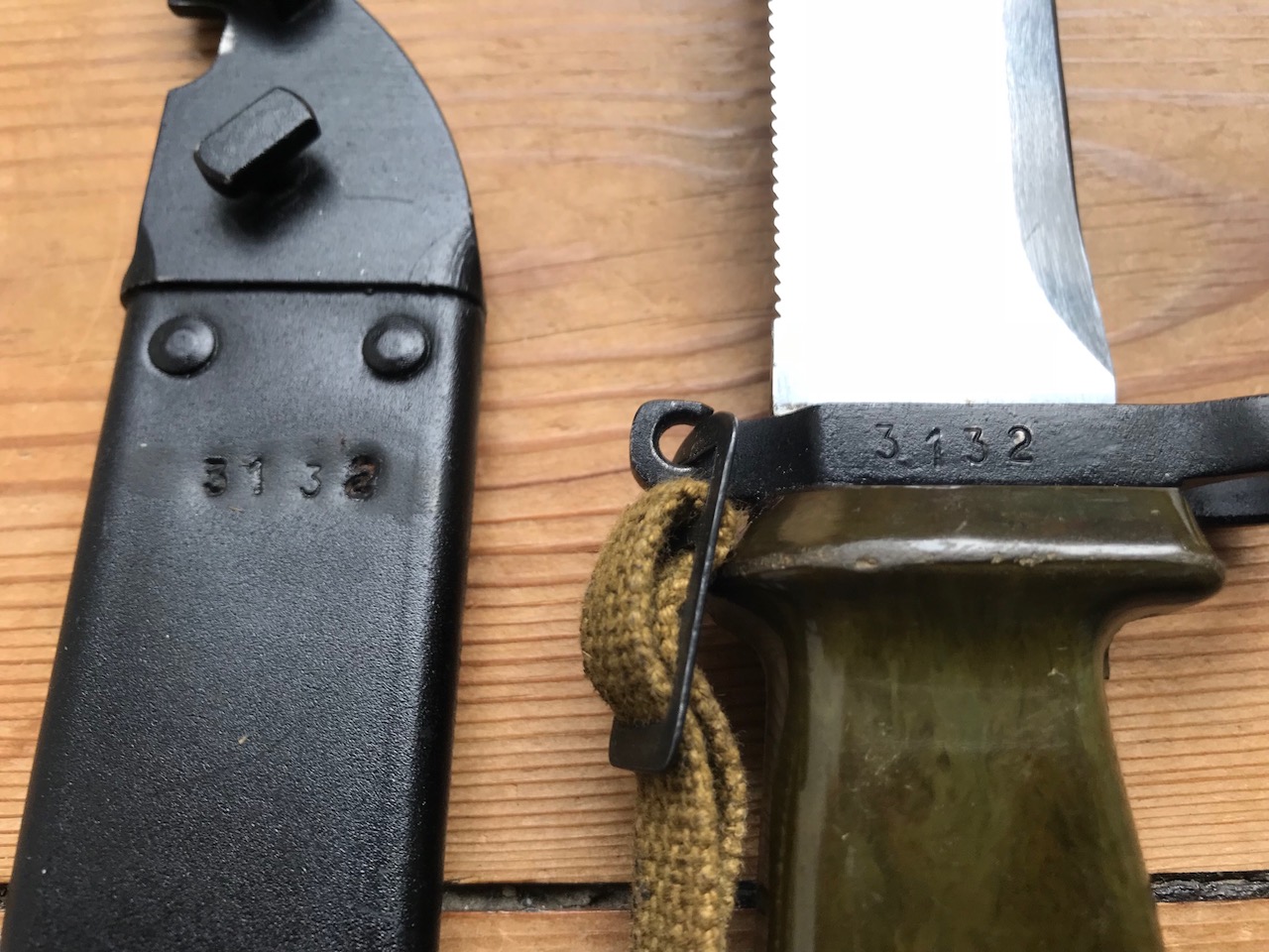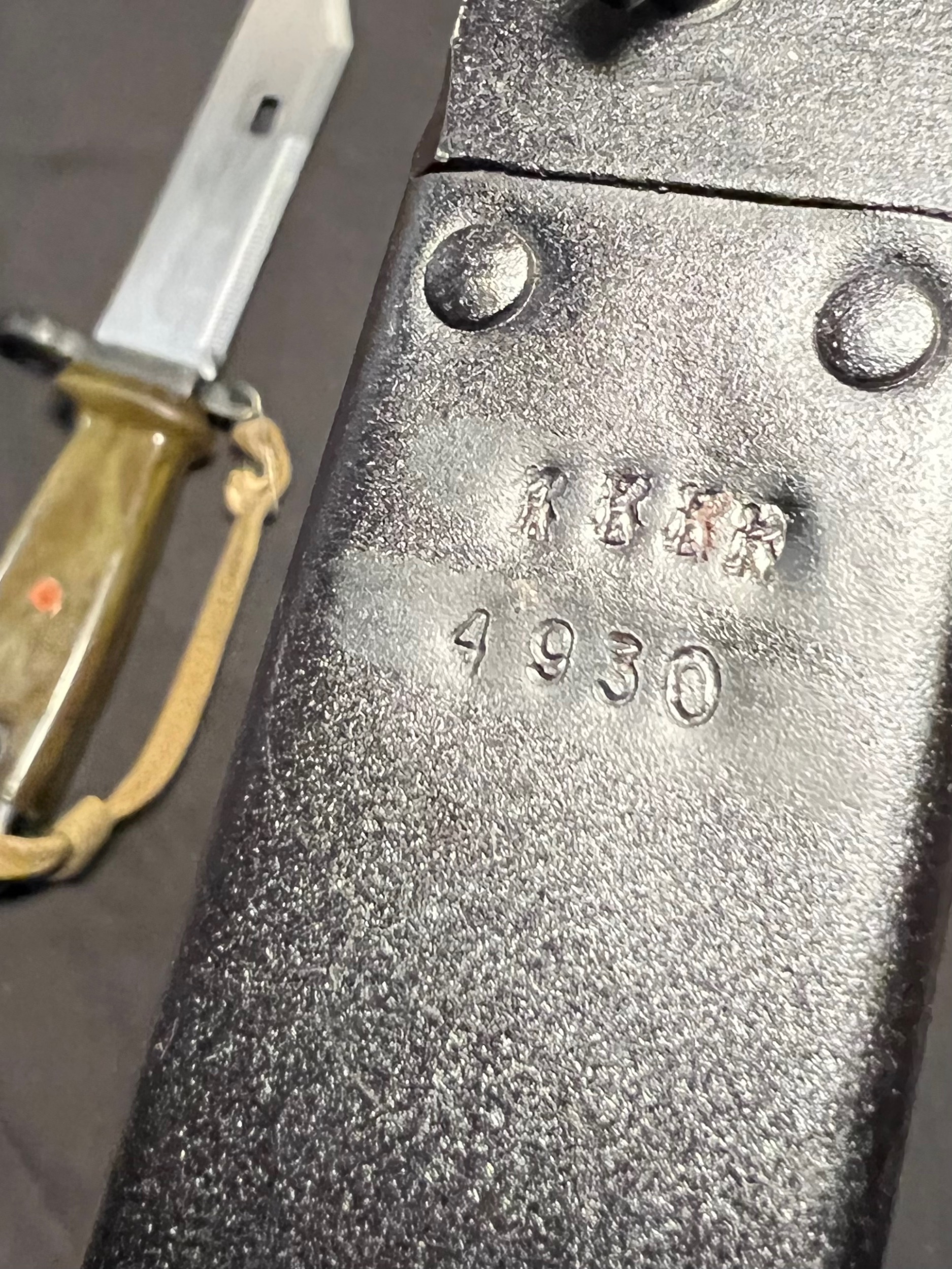 This is the second one. Serialized 4930. This bayonet shows a more obvious force matching of the scabbard. Existing numbers are stamped over and new ones applied. I dont see older numbers underneath the new ones.
