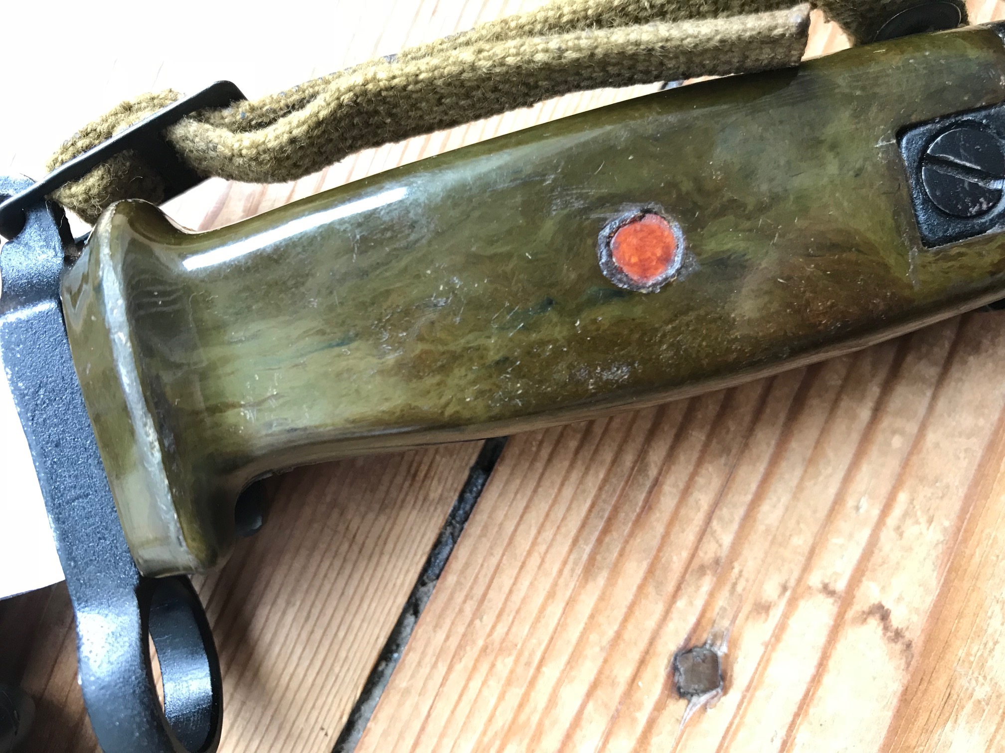 Comparison pics between the green bakelite of the Russian border guard bayonet and Chinese green.
