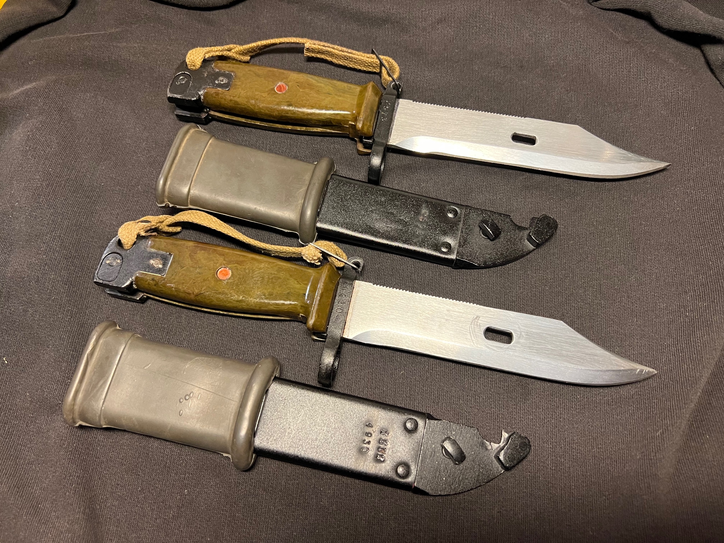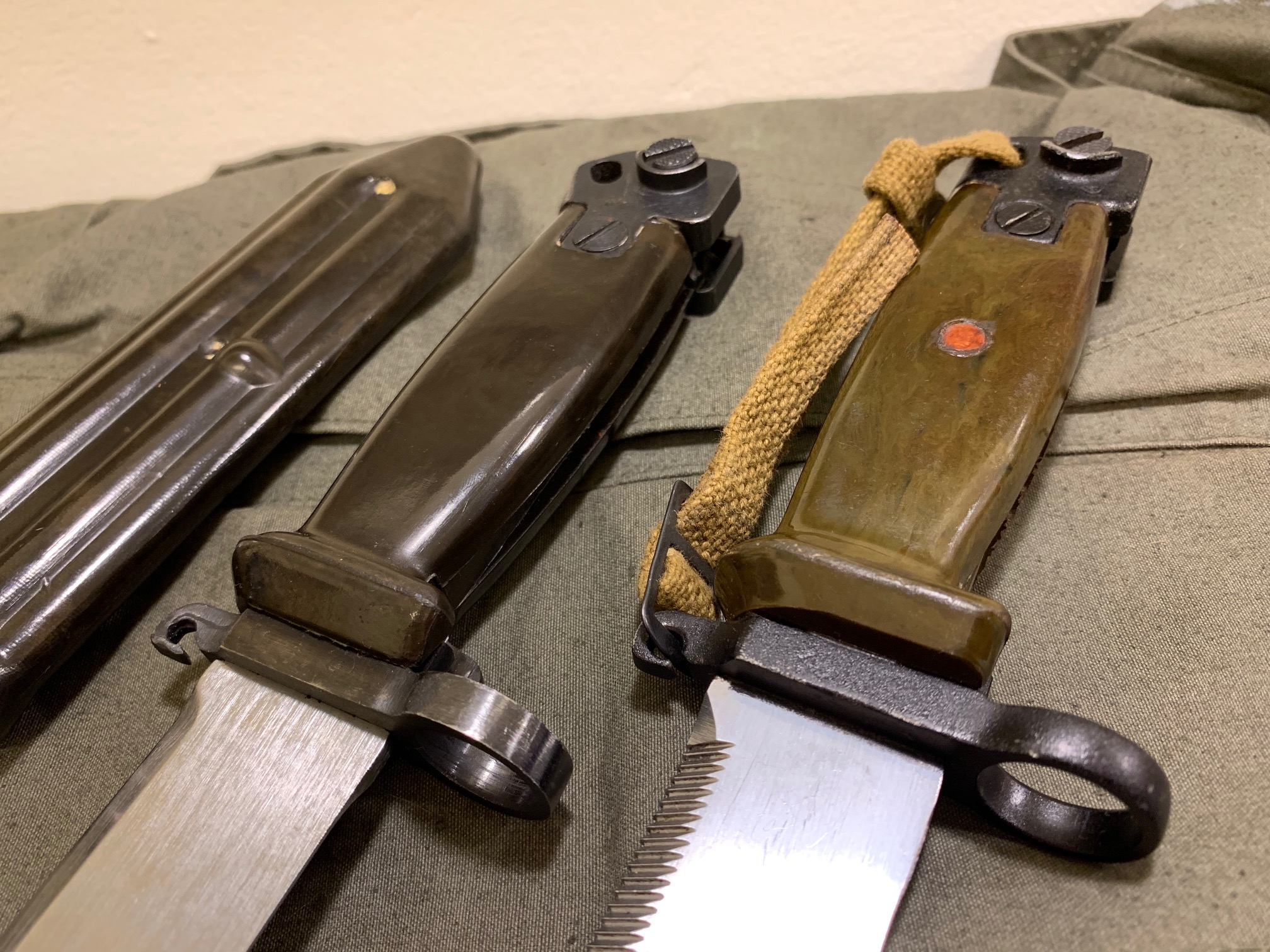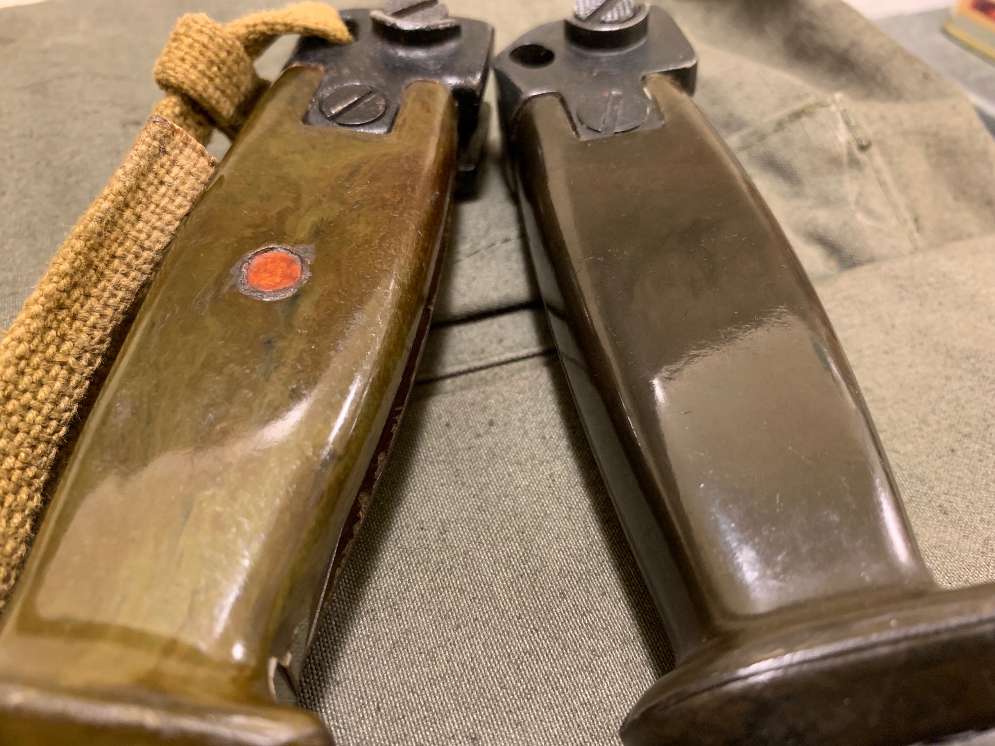 Here are my two current border guard bayonets in all their green glory. Each of em has some interesting details to observe.