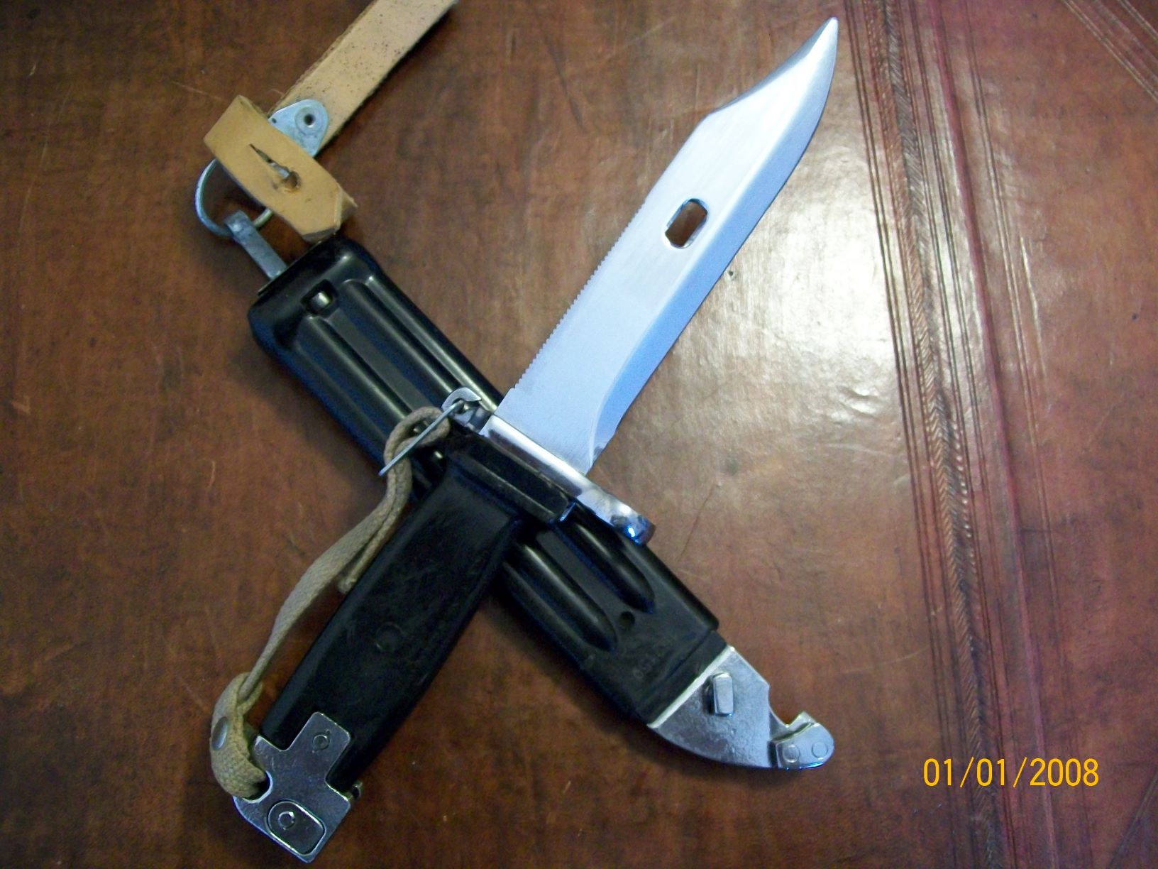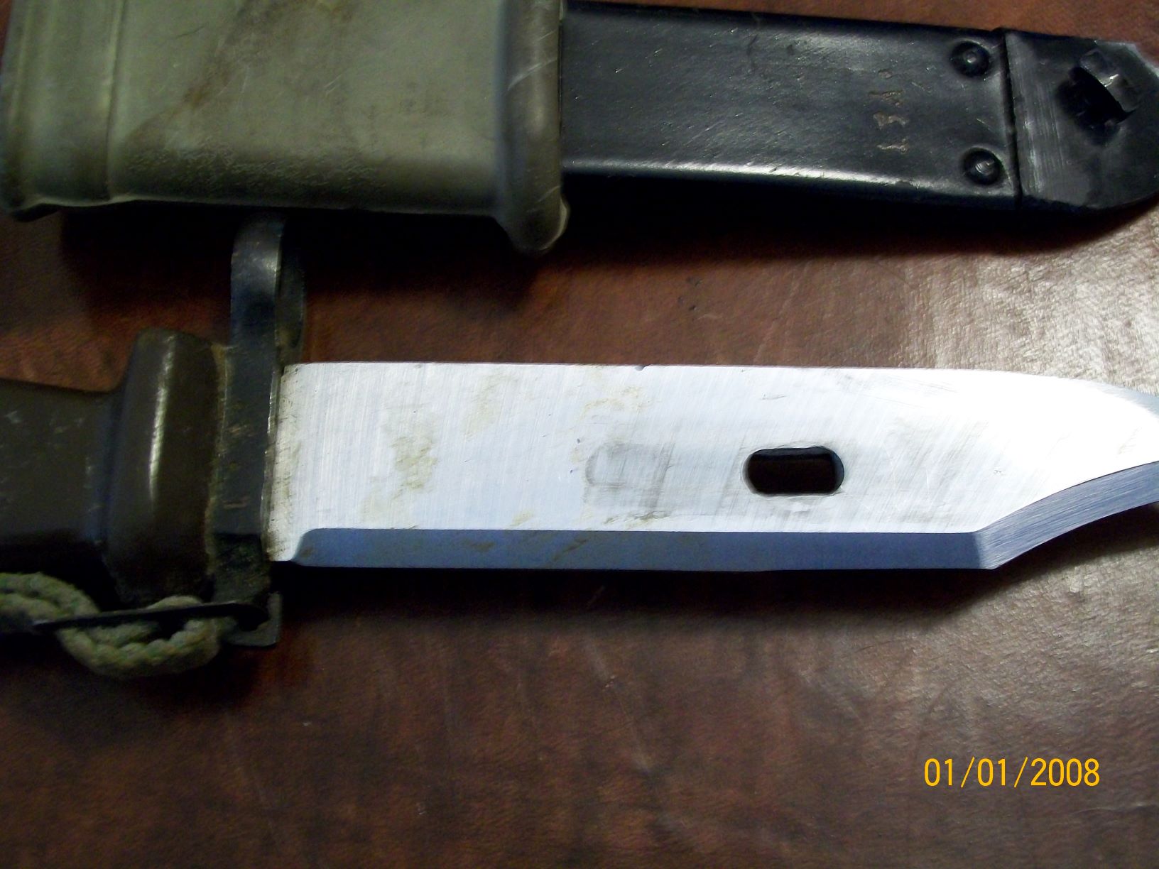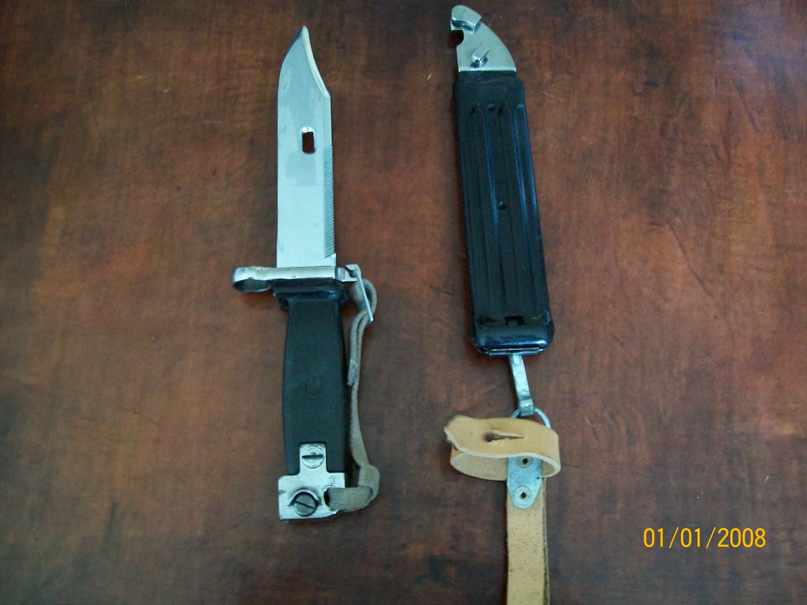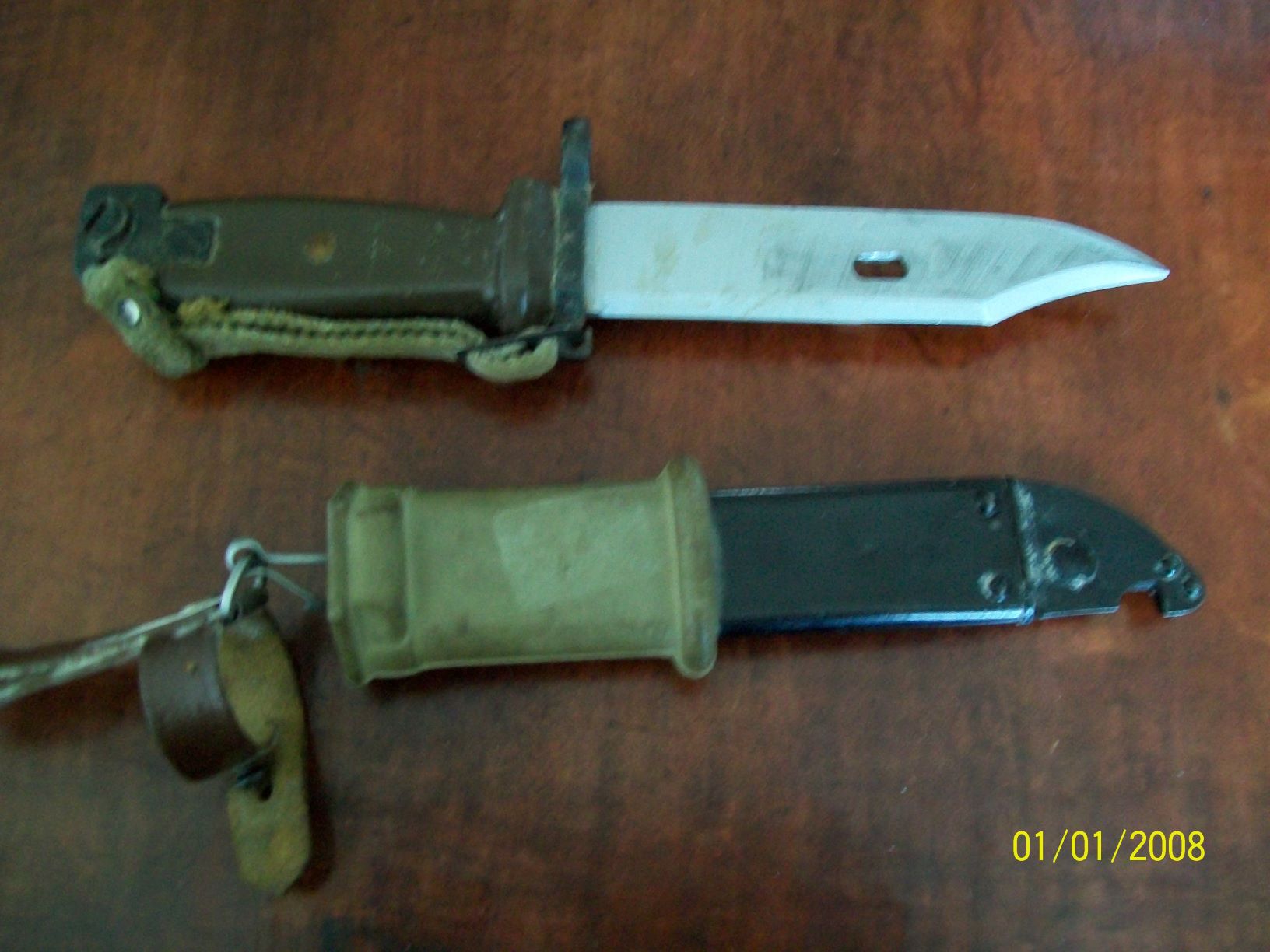 You can see a yugoslavian chromed, a polish 6H4 chromed, an early russian (the first picture and the last) with a particular scarbard (without rubber and a particular hanger) and two pictures of a maadi with a white rubber and no sawteeth.