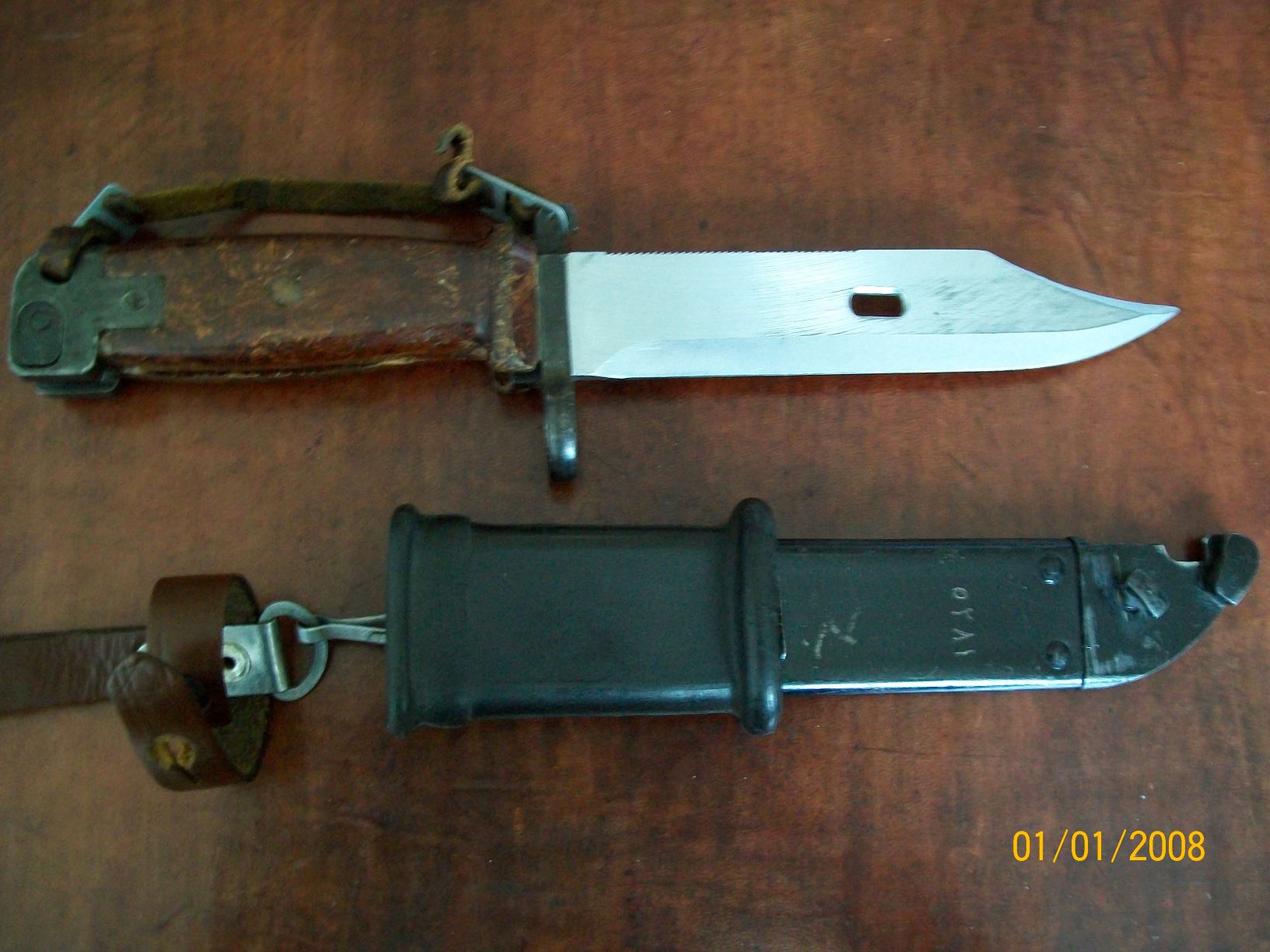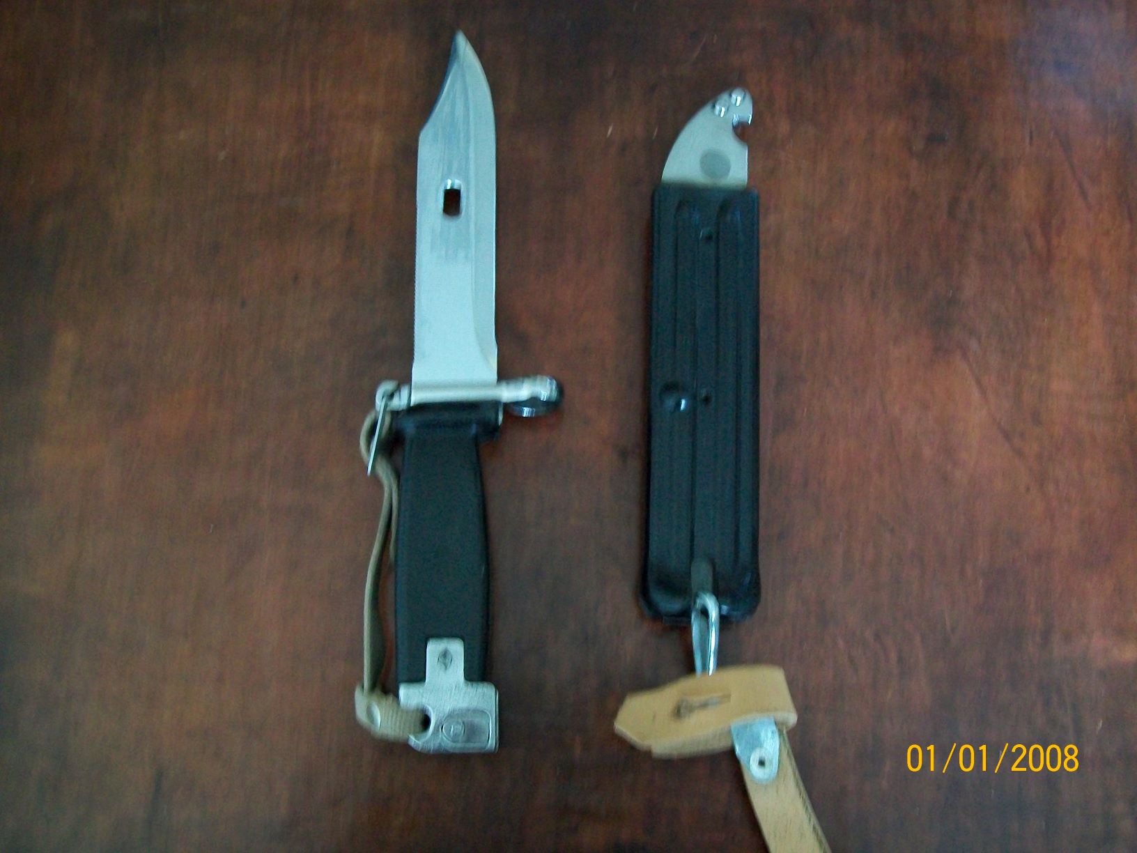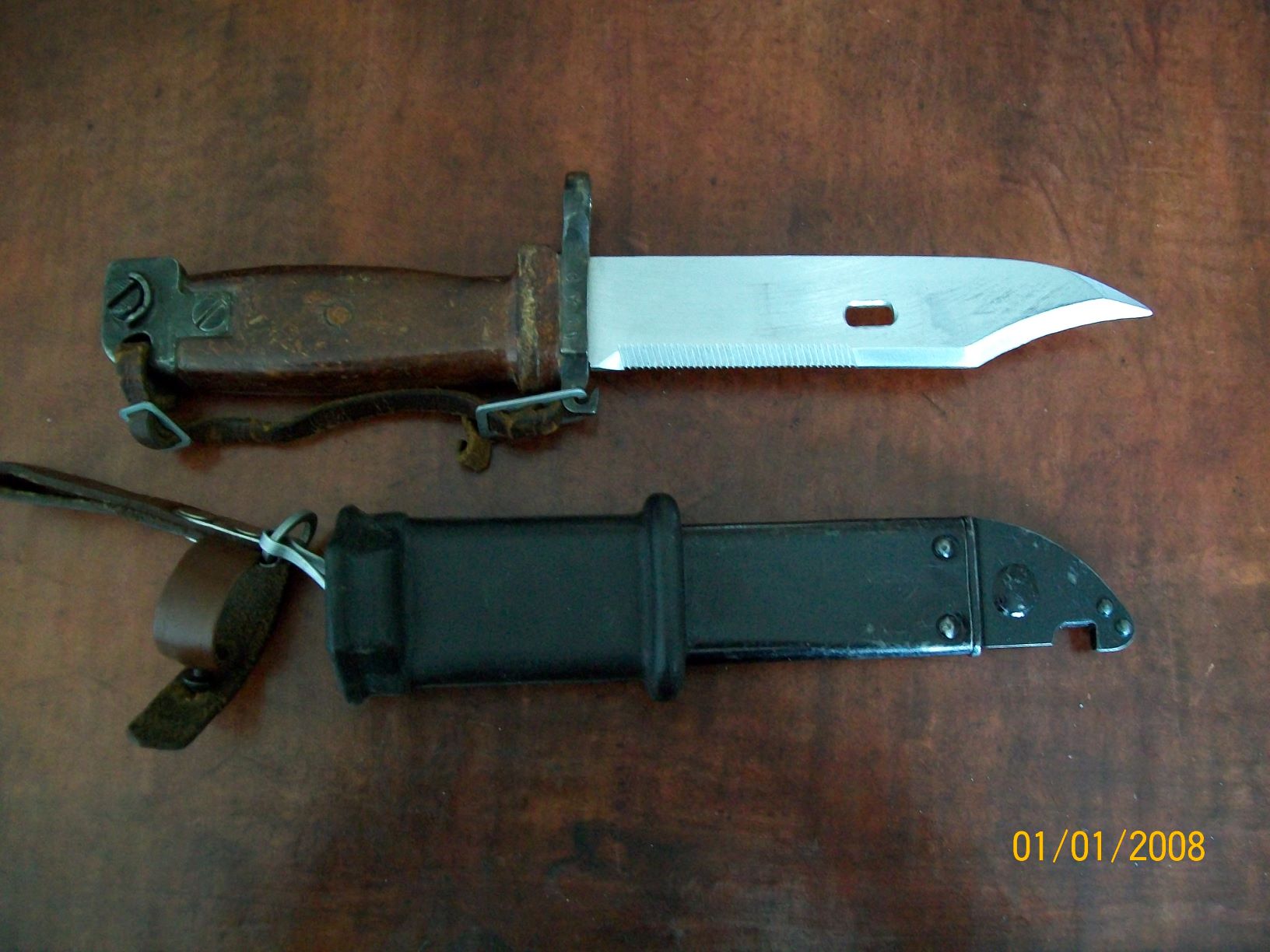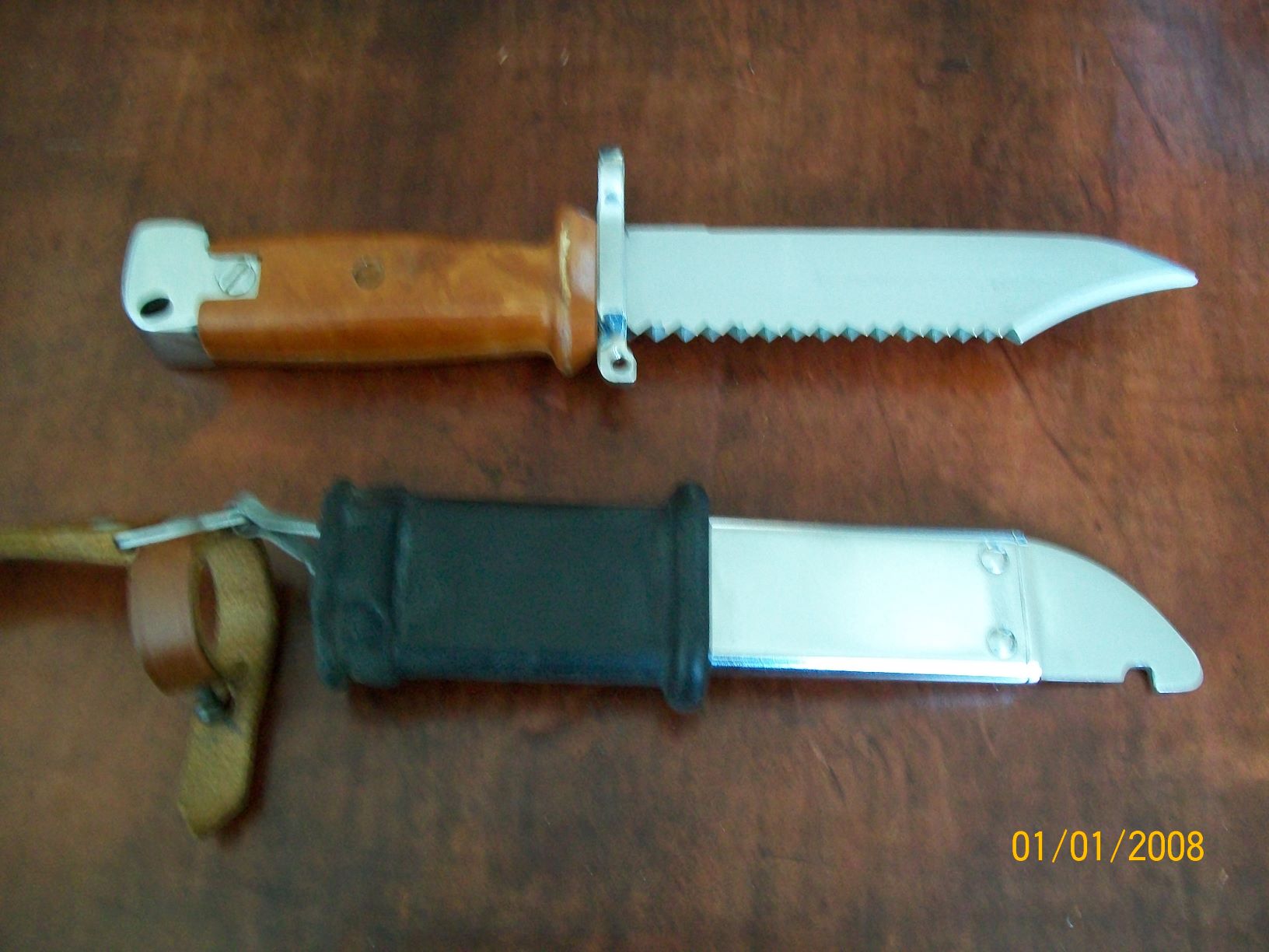 You can see a yugoslavian chromed, a polish 6H4 chromed, an early russian (the first picture and the last) with a particular scarbard (without rubber and a particular hanger) and two pictures of a maadi with a white rubber and no sawteeth.