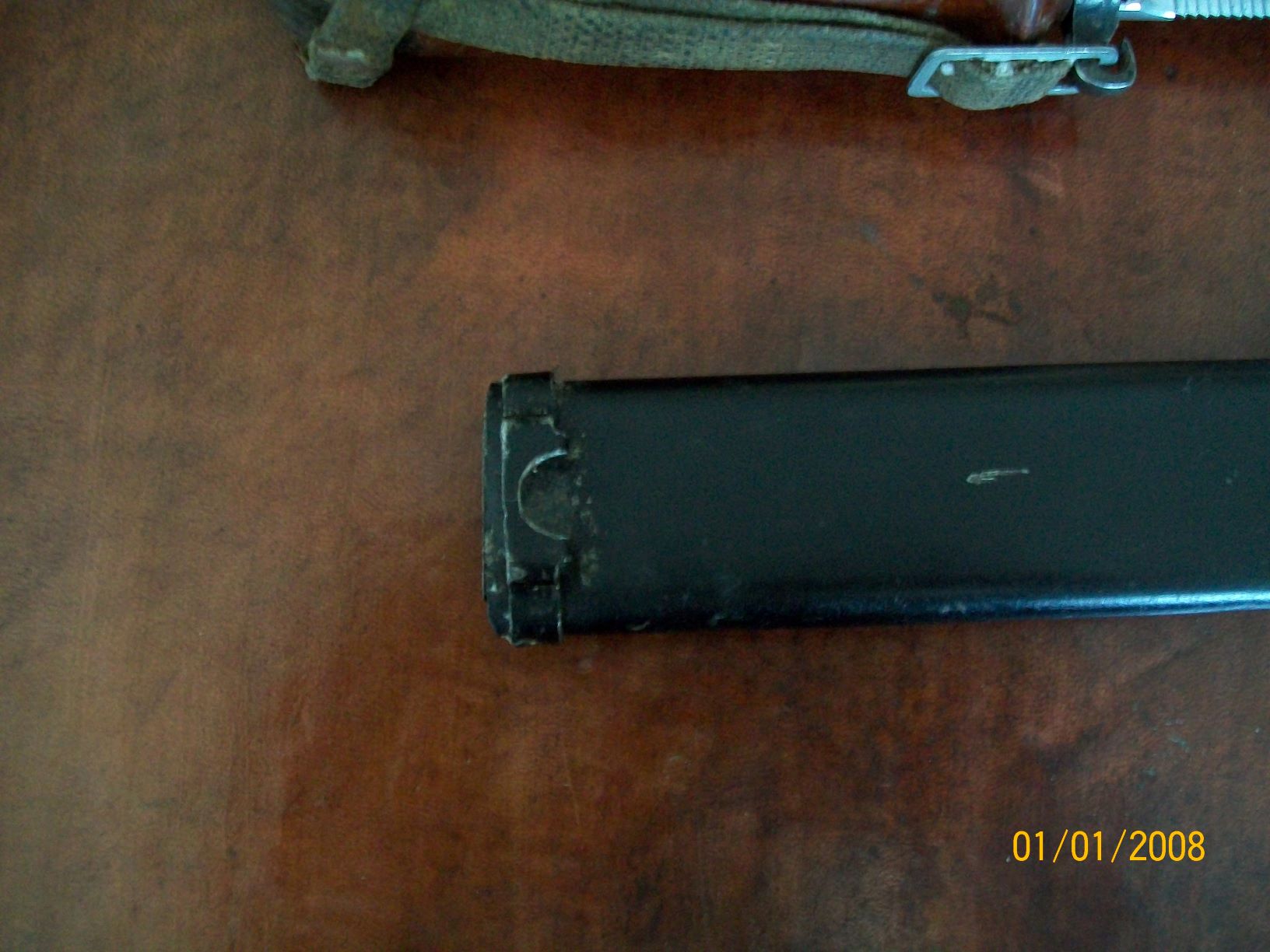 The third item is a Yugoslavian AKM 6X4 Type II bayonet and scabbard. It is very unusual as the metal parts of the bayonet and scabbard have been nickel or chrome plated at some point in time. Where, when and why is questionable. I have never seen one like this. From what I can see in the pictures it appears both the bayonet and scabbard have the usual issue numbers, but are miss-matched. The hanger and strap appear to be original and correct. Also interesting to note that the plating does not take well to the weld on the back of the cutter plate. I am not sure what the plating of a standard bayonet and scabbard with mixed numbers represents. Perhaps some special dress or parade use? Mike