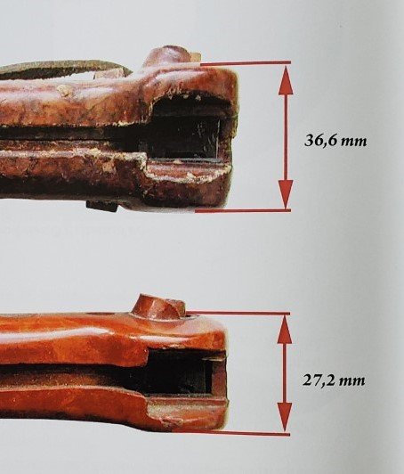 here's one last picture of the left side of the pommels. The ridge around the catch button is round in shape on the GH and more squared off on the latter version. The small ridge on the opposite side is also a different shape. M.