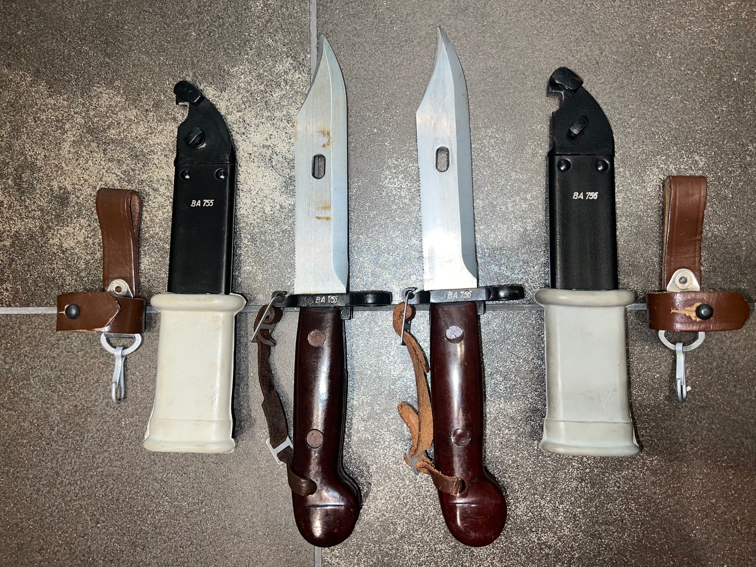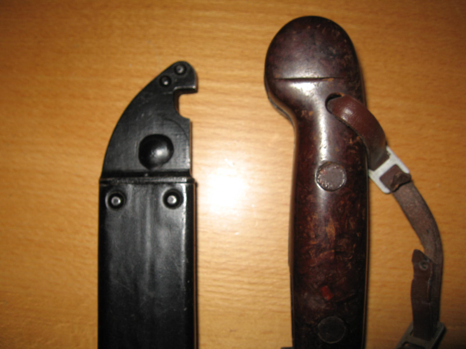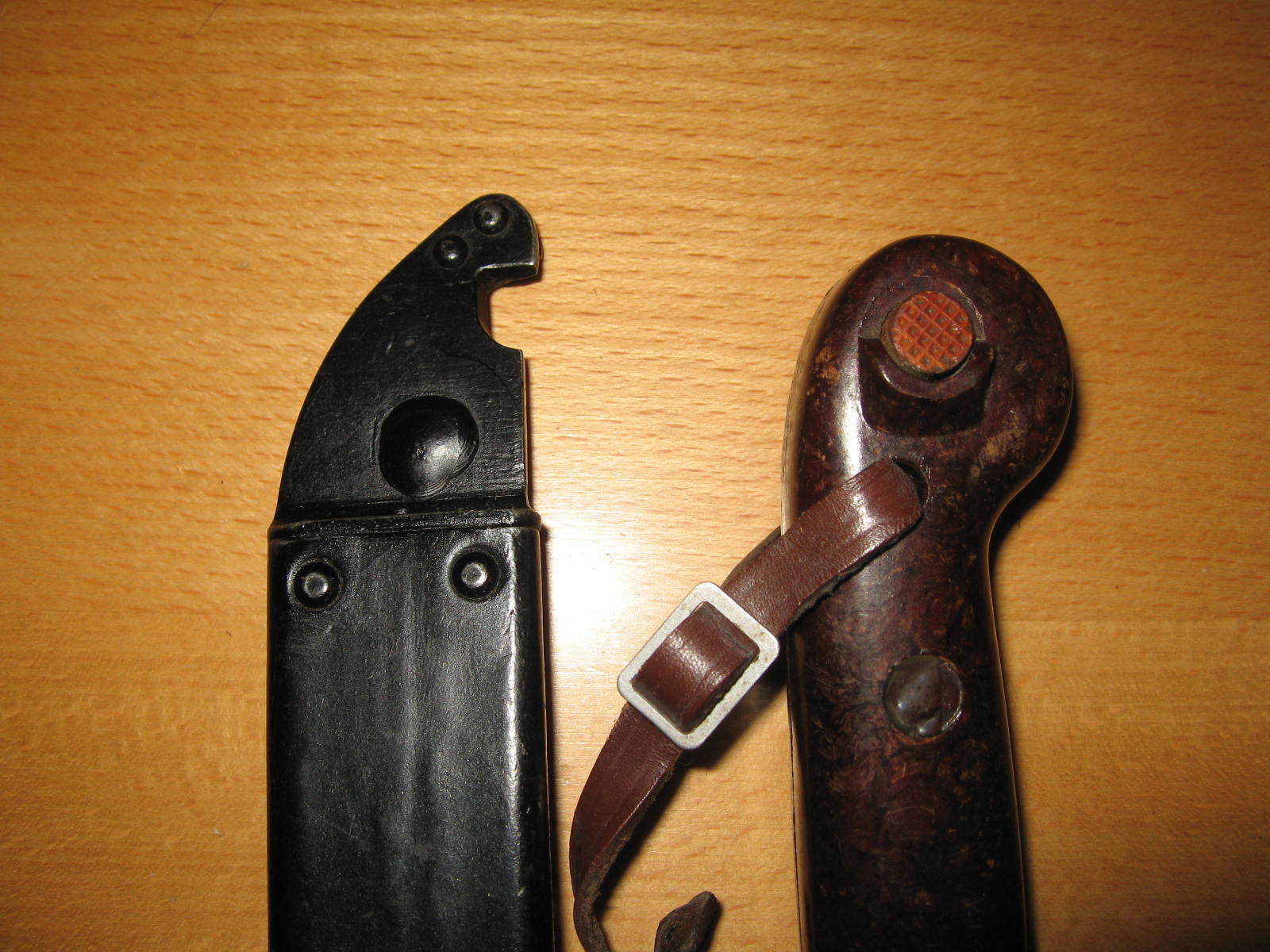 These flat pommel bayonets are very unique and a bit of a mystery. They are early production and limited in number. They were manufactured intermittently during the same time period that the standard bulbus pommels bayonets were made. It is unknown why they would change over to manufacture the flat pommels using different molded grips and release catches. The scabbards also are painted and different hangers issued. These bayonets and scabbards appear to be higher quality items than the standard issue ones. Were they made for special contracts or special units? Maybe for parade or dress functions or symbols of rank? Does anyone have any information or ideas about what and why they were made?