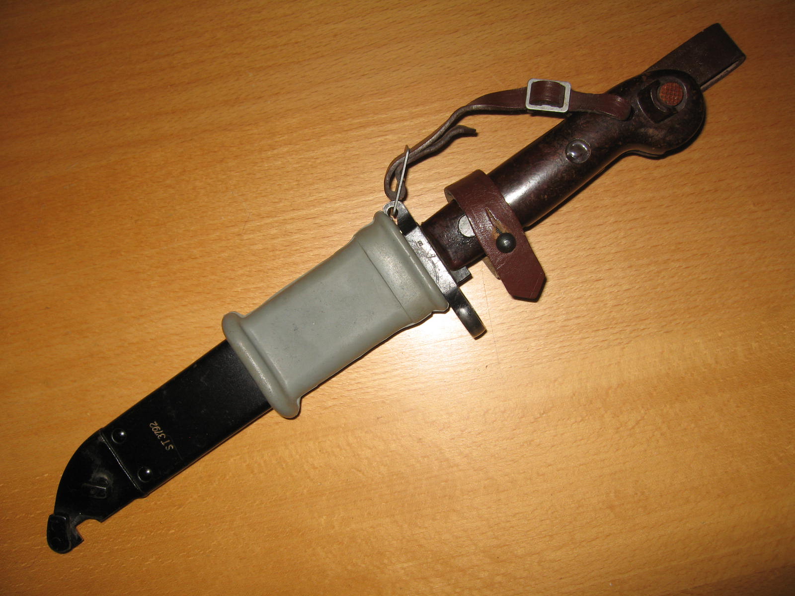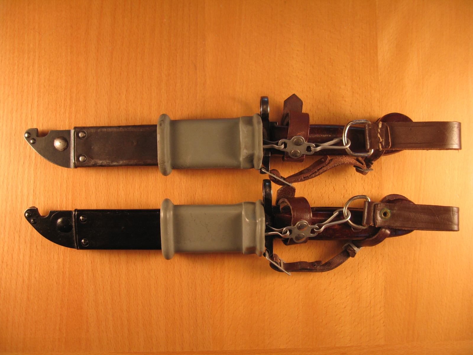 AK bayonet collecting has been slow lately and i have been curious about the Romanian AKM 6X3 bayonets with the flat sided pommels. These bayonets are similar to the AKM 6X3, 6H3 bayonets produced and issued by the other ComBloc countries. In 1963 Romania designed and started producing a unique variation with grip panels ending with a thicker, bulbous pommel shape. This wider pommel also required the release catch to be lengthened to protrude past the wider grips. This was done by machining a longer shaft and possible a longer button as well. This bayonet with the bulbus pommel was produced continuously until superseded by the AKM 6X4 bayonets.