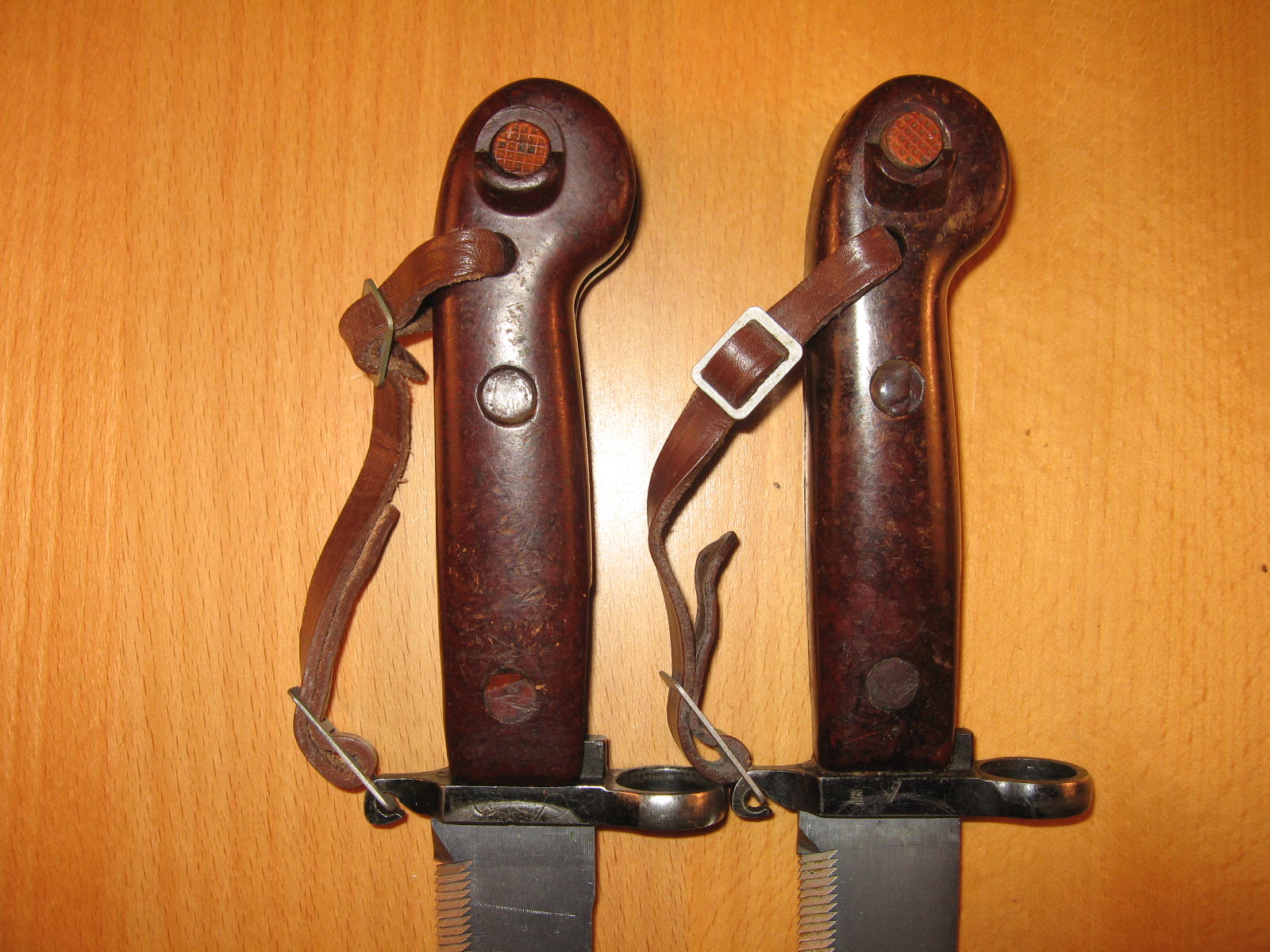 Something else to notice on flat pommel Romanian bayonets as well as the other types. Observe the wear marks on the sides of the cross guards. If there are semi elliptical marks on one or both sides one can tell if that bayonet has been worn with a one or two piece snap hook hanger and not the wraparound style ones. I have six or seven flat pommels in my possession and all of them have had the snap hook wear marks. Hanger are notorious for being switched around, but this is one way to see if the hanger/bayonet combination is "correct". M