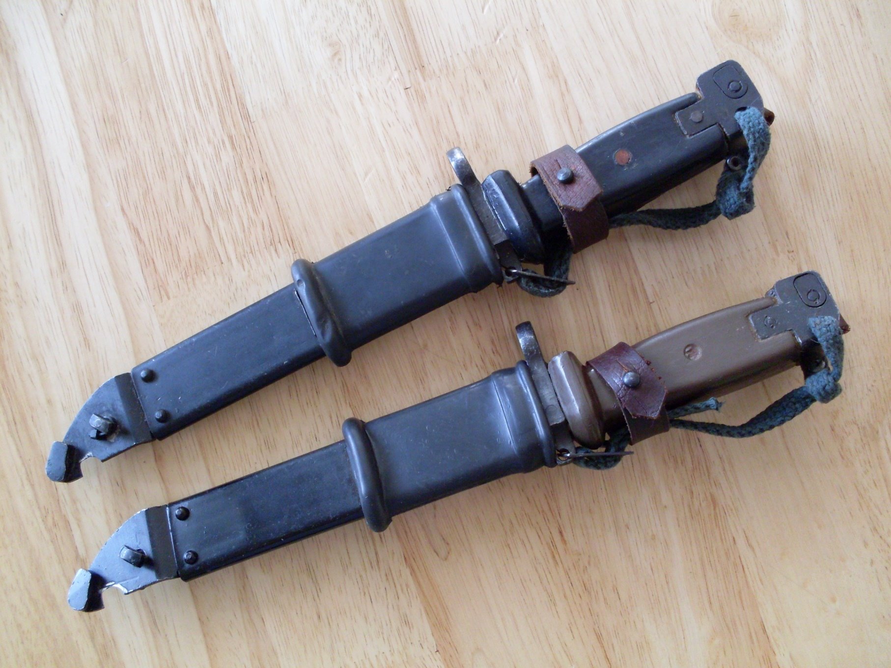 Very nice examples of the two basic types of the Egyptian AKM bayonets. The appear to be complete with the correct hangers and straps which are getting difficult to find. Mike