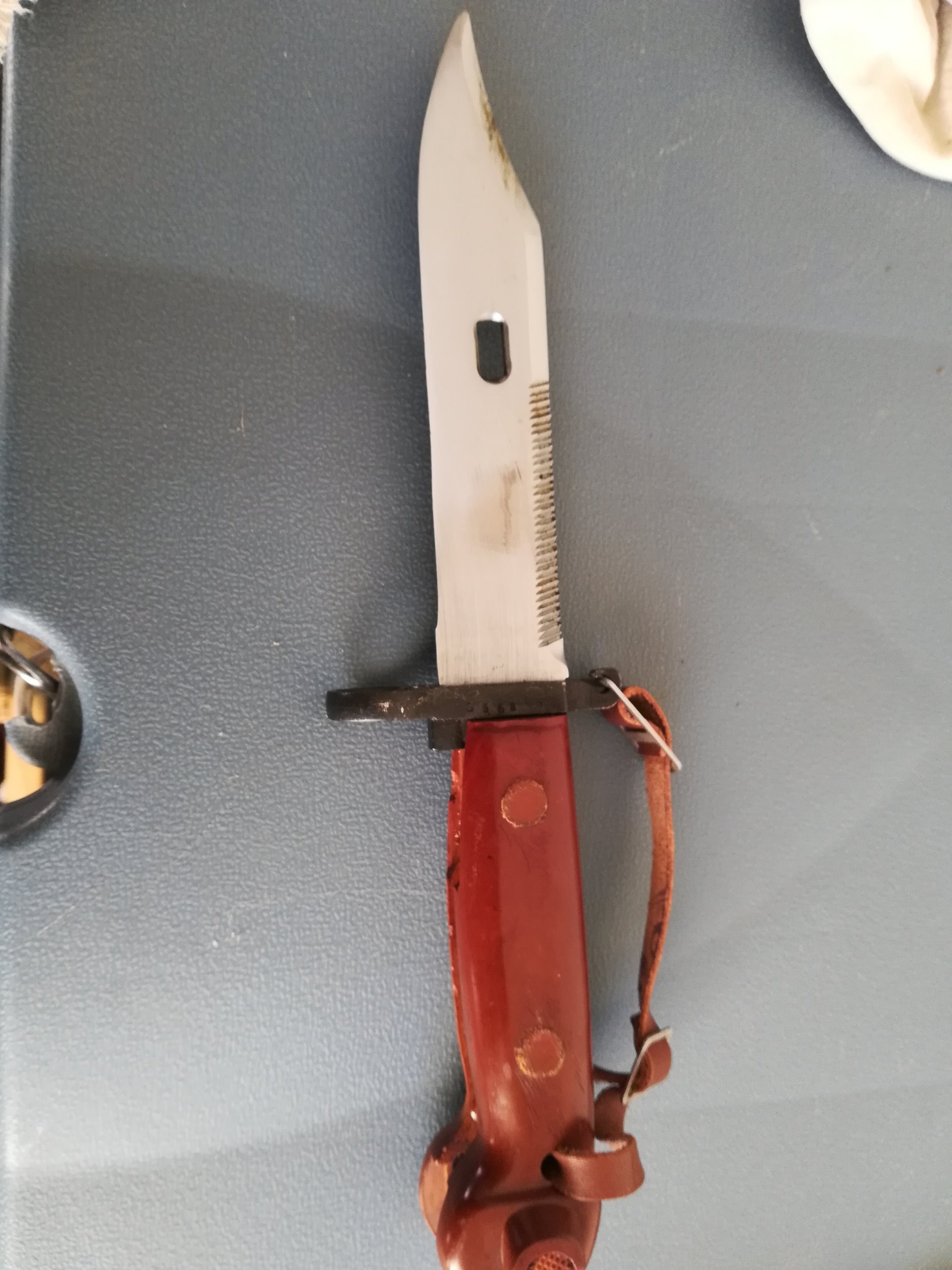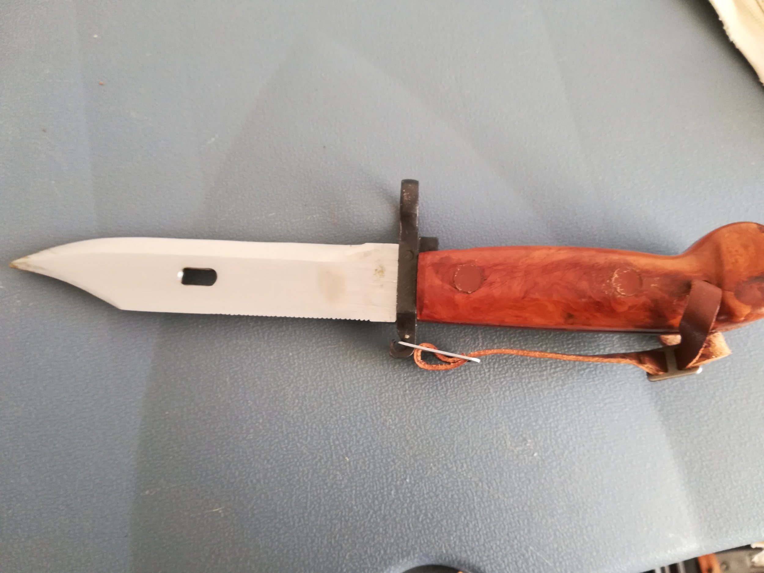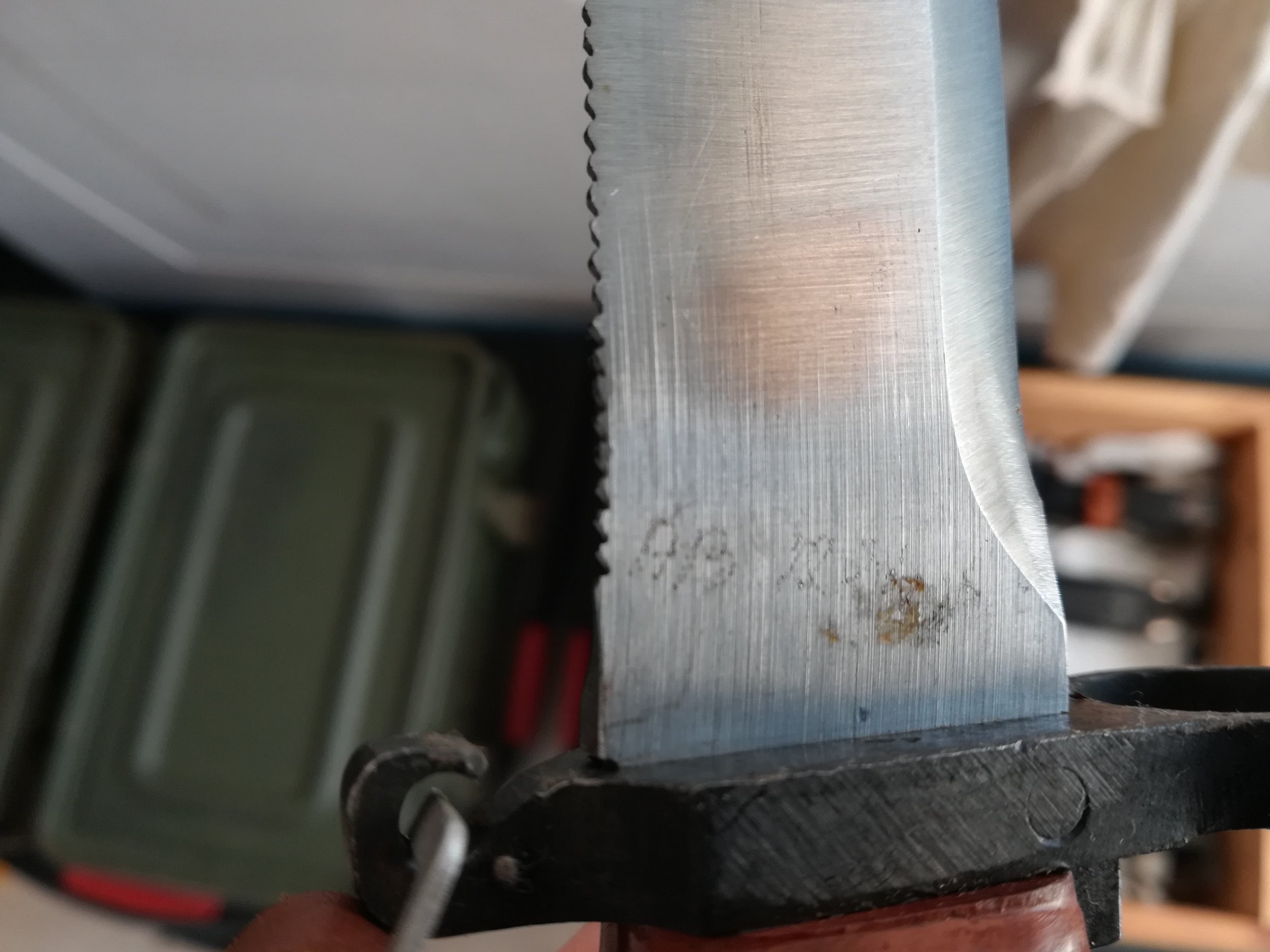 This bayonet appears to be a standard Romanian AKM 6X3 that has been reworked. Grip panels replaced, blade re-sharpened, etc.. The original numbers ground off from the left side of the crossguard. I have never seen a number hand etched on the blade ricasso. It appears to be a typical Romy style one. It could either be the original or an intended rework number. Perhaps temporary for inventory control. The number stamped on the the right side of the crossguard does not seem to me to be Romy in style or placement. My best guess is that it was sold to and numbered by another country. Very unique and interesting variation.