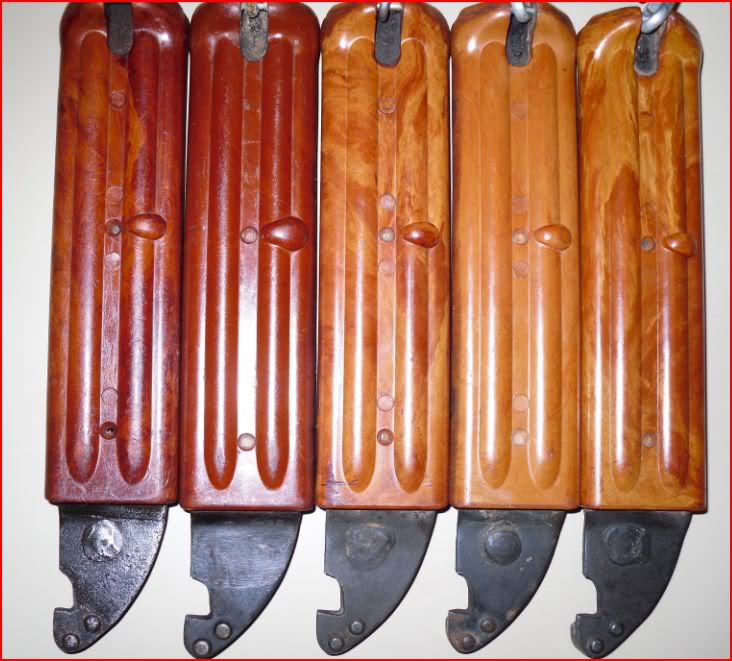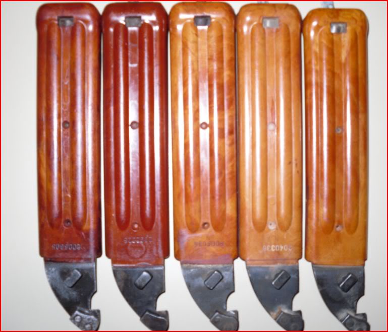 Here is a picture of a group of17 Tabuk bayonets and scabbard from another site. I am posting this to show the different variations in color and other small details. Also note the variations in the hangers as mentioned by Martin. They cross both directions. Interesting! Tabuk or not Tabuk? Mike