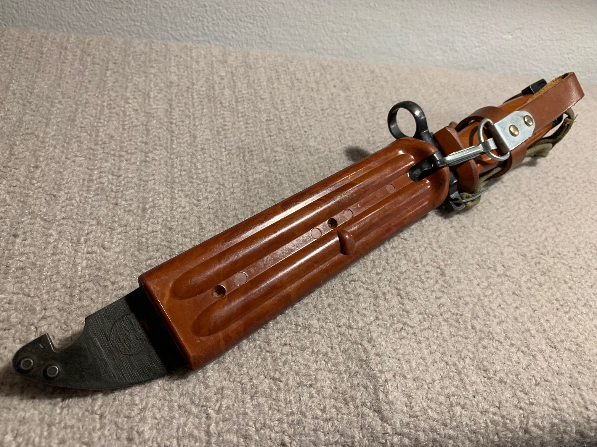 As with Richard's hanger, all of the hangers that I have seen from bayonets captured in the Tabuk factory have hangers that fasten right over left as viewed from the front versus left over right for Yugoslav hangers. There is alos differences in Tbauk made wrist straps vs. Yugoslav made wrist straps.