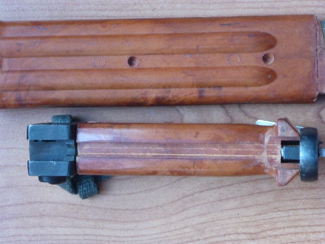 Here is another one of my Tabuks. This one is like new, un-numbered and appears unissued. Note the differences from the first one. Visible rivets on the cross guard and the cutter plate weld ground smooth, etc.. Also the different snap hooks on the hangers. M.