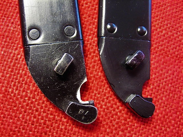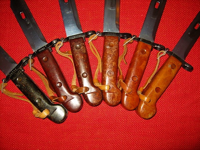 Attached are pictures of my six 6H3's showing color variations. All are in excellent to new, unissued condition. Two have matching numbers, two are un-numbered, un-issued, one has an un-numbered scabbard. One has miss-matched numbers to display an early(?) blued scabbard, the rest are painted black. Notice it is similar to the Romanian scabbards as the blue does not 'take' on the pivot weld. Also note the different rivets on the scabbard from flat to rounded. Mike