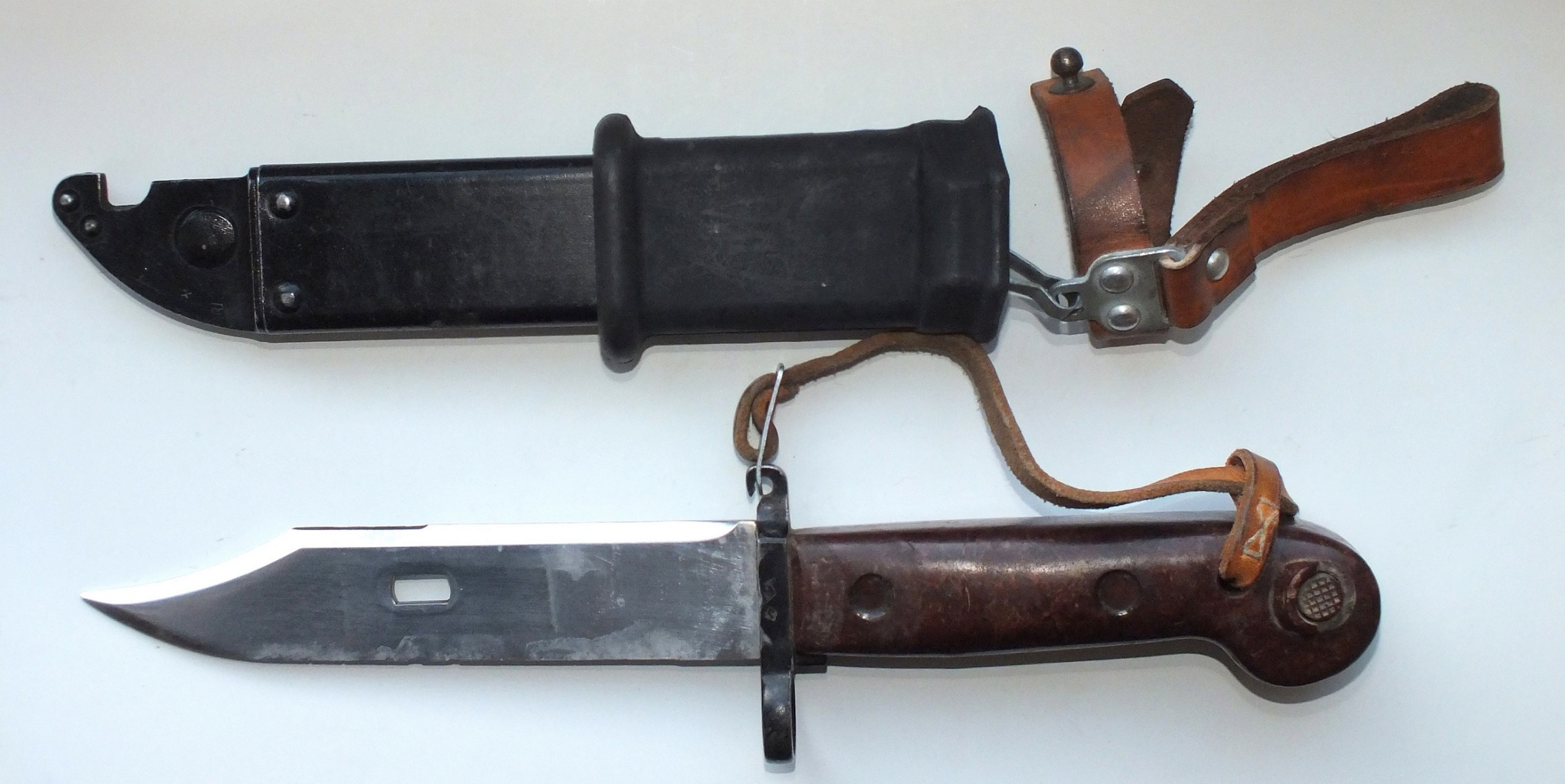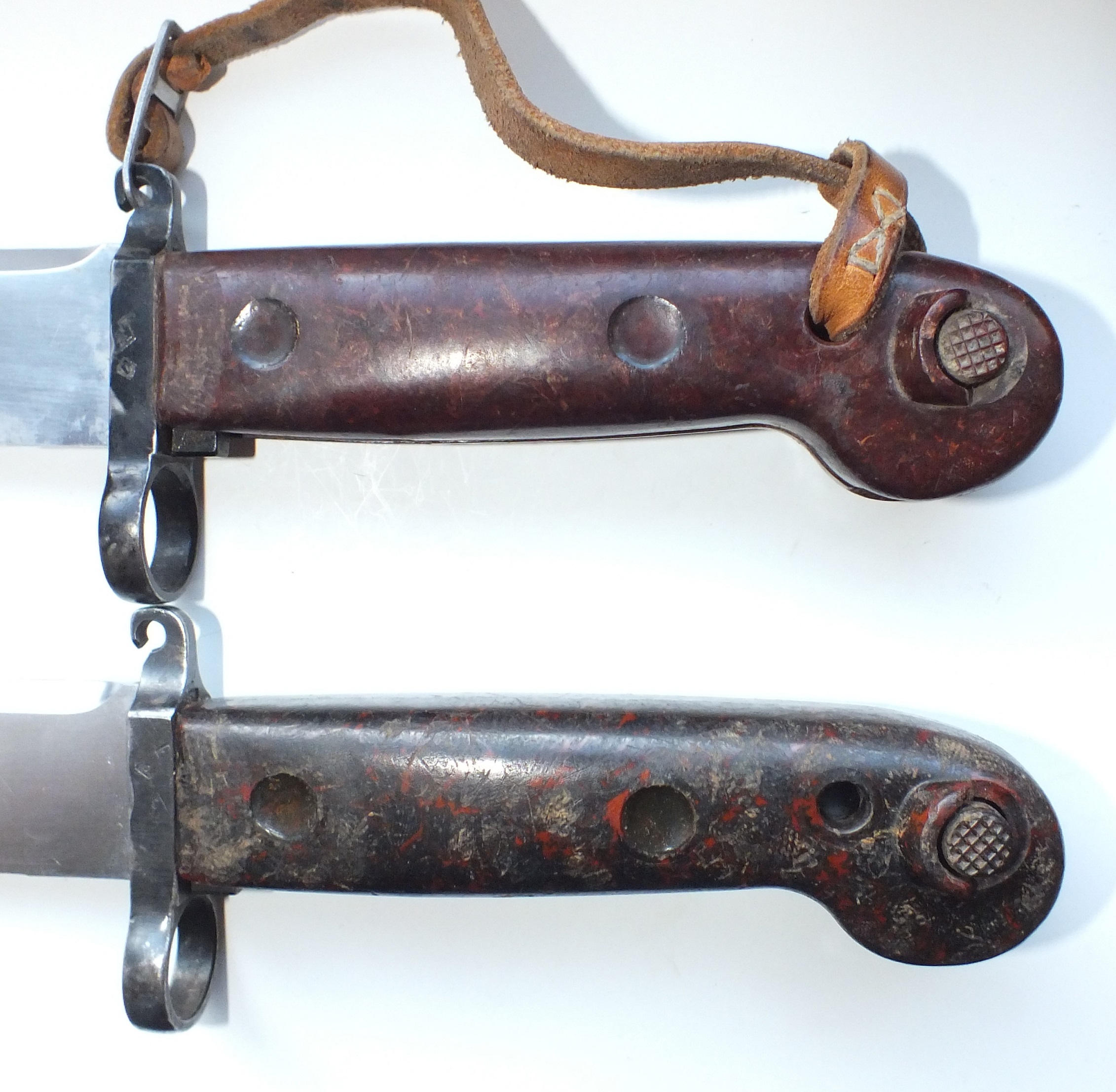 Hey Brian, I was just looking back at other posts and notice something on the 1st one. You mentioned it's from your files and perhaps not your picture or bayonets. Did you notice that two of the scabbards have the later style long insulators that were on some of the Polish AKM 6X4 bayonets from the "Archer" series? These are somewhat uncommon. Also the solid orange grips are interesting, I've never seen one of these close up. Are these the orange replacement/rework grips you mention? Do the bayonet & scabbard show other signs of being reworked? Mike