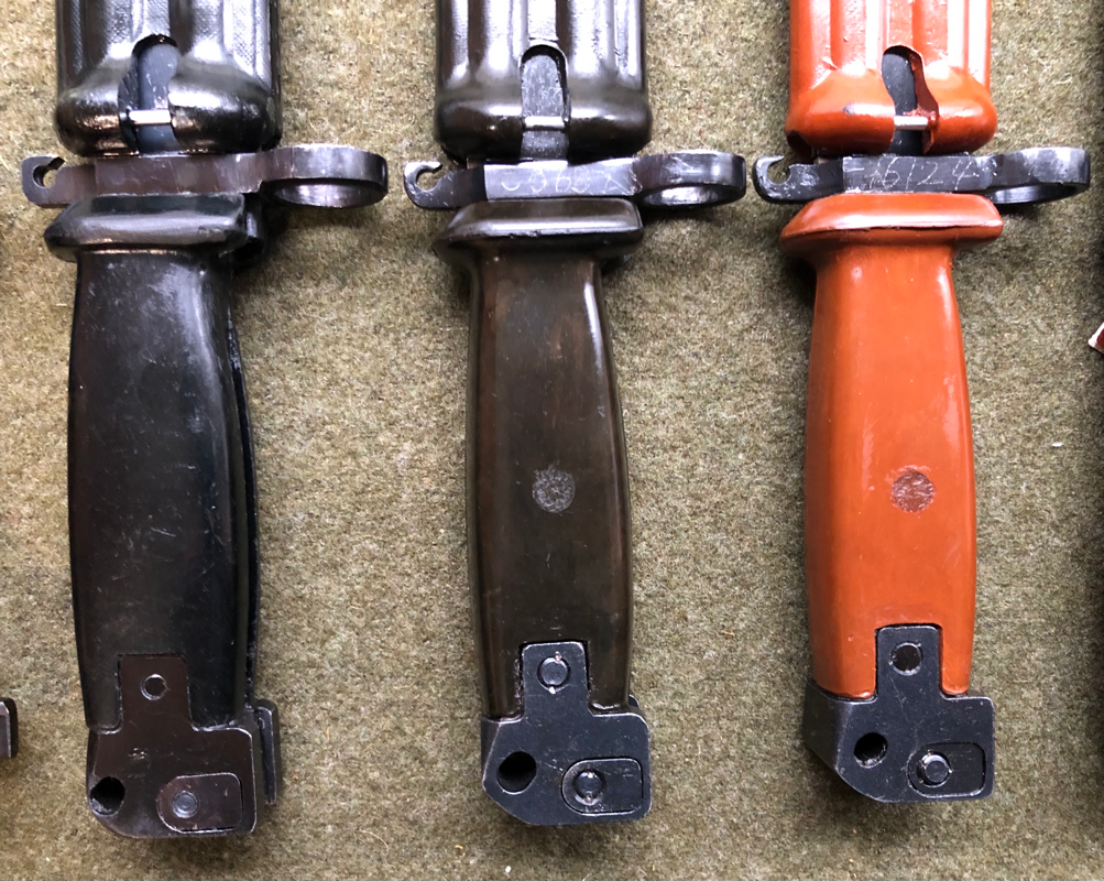 Posting my collection of Chinese Bayonets to date for reference. Two AK47 Models, a Dark Brown and Light Brown Handle Variants. Three AKM Models, Black, Green and Orange Variants. The last two are not considered legitimate, however I like them in the collection.